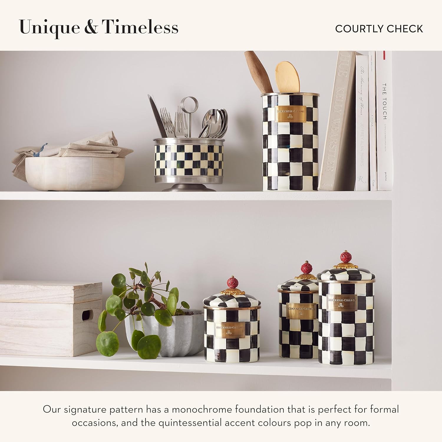 - KITCHEN DECOR ESSENTIAL: Our Courtly Check kitchen utensil holder is an ideal kitchen container with a classic iconic pattern. It features a palette of jewel tones hand-painted into our checked pattern to complement any black-and-white decor in a whimsical cooking space.