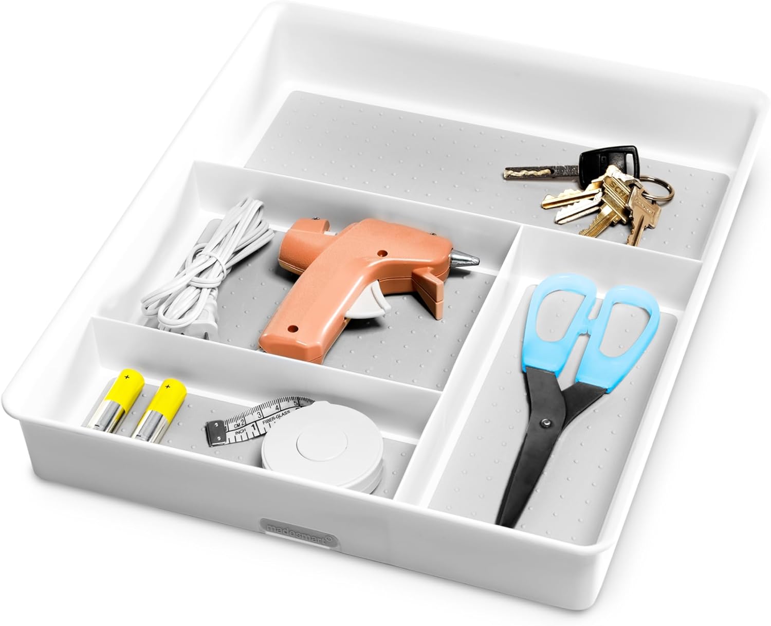 Madesmart Classic 4-Compartment Drawer Organizer Gadget Tray, Plastic Multipurpose Storage Bin for Drawers, White