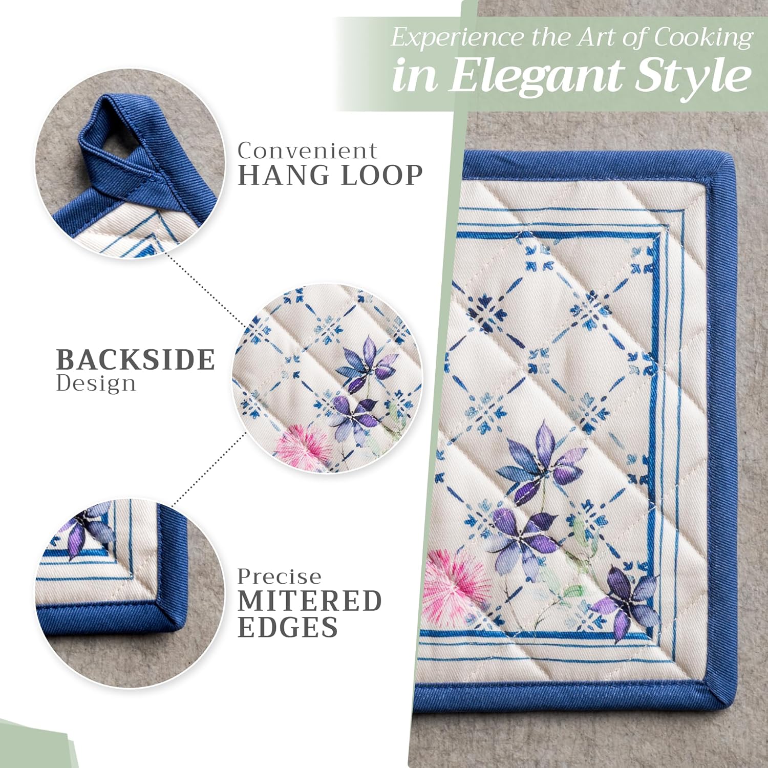 - Artistic style: Add charm to your kitchen with our oven mitt pot holder set featuring watercolor designs inspired by traditional European motifs. Stylish and functional kitchen accessories for every home cook or gift occasion.