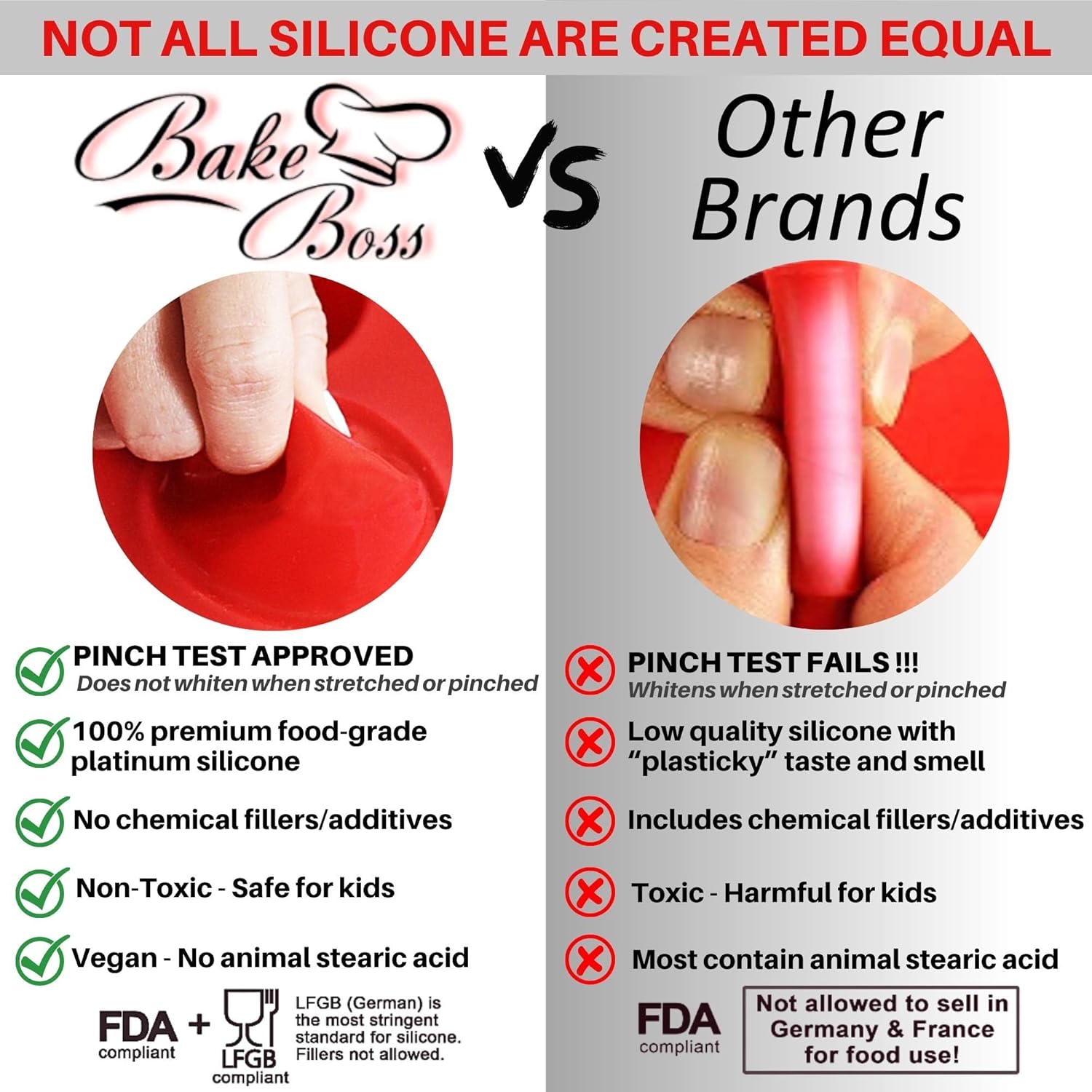 - NON-STICK FOR EASY RELEASE: Bake Boss silicone muffin tray thickness guarantees even cooking and avoids your standard muffins to get burnt. Just press the silicone cupcake pan upwards from the cup bottom and your muffins will pop out of muffin pans nonstick 12.