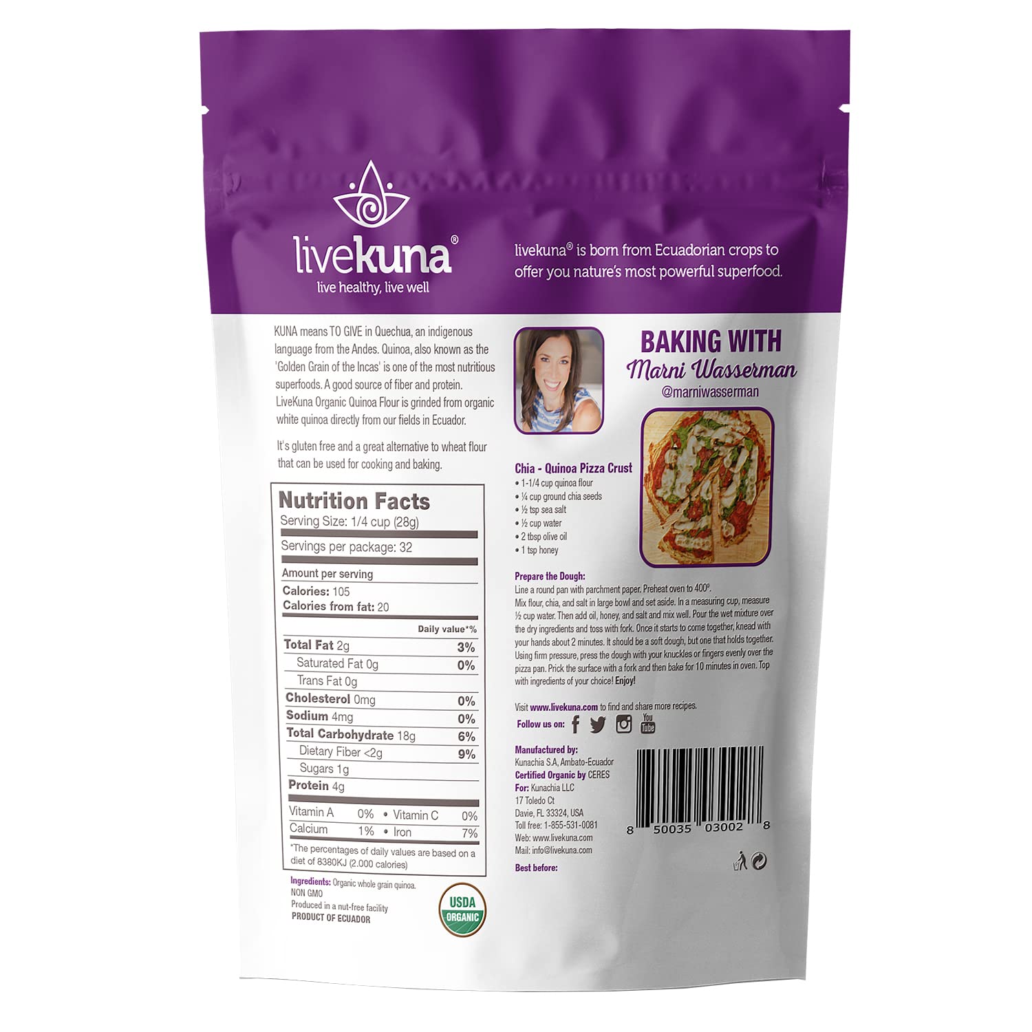 - Versatile Flour Substitute - Grinded from organic white quinoa directly from our fields in Ecuador, LiveKuna Flour is simple to use and great for use in things like dressings, beverages, gluten free pancake mix or bread flour for baking. Embrace its adaptability as a superfood boosting ingredient for your baking needs.