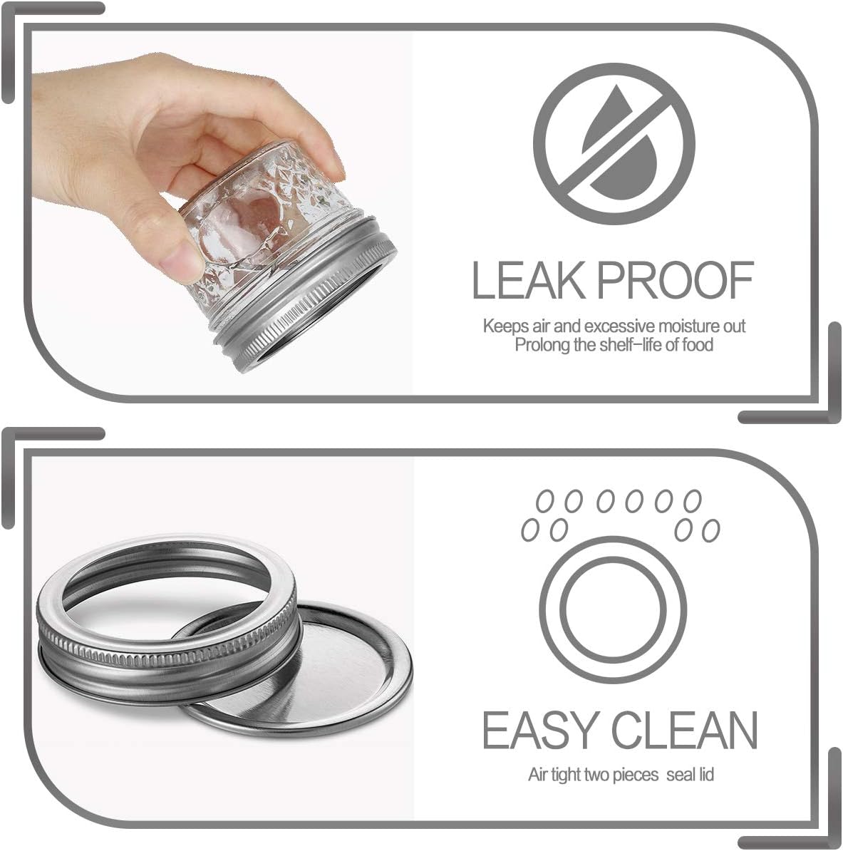 - FOOD GRADE:Each mason jar is made from food grade materials.Great for food storage.Suitable for use in preserving and canning. Safe for the refrigerator and the freezer