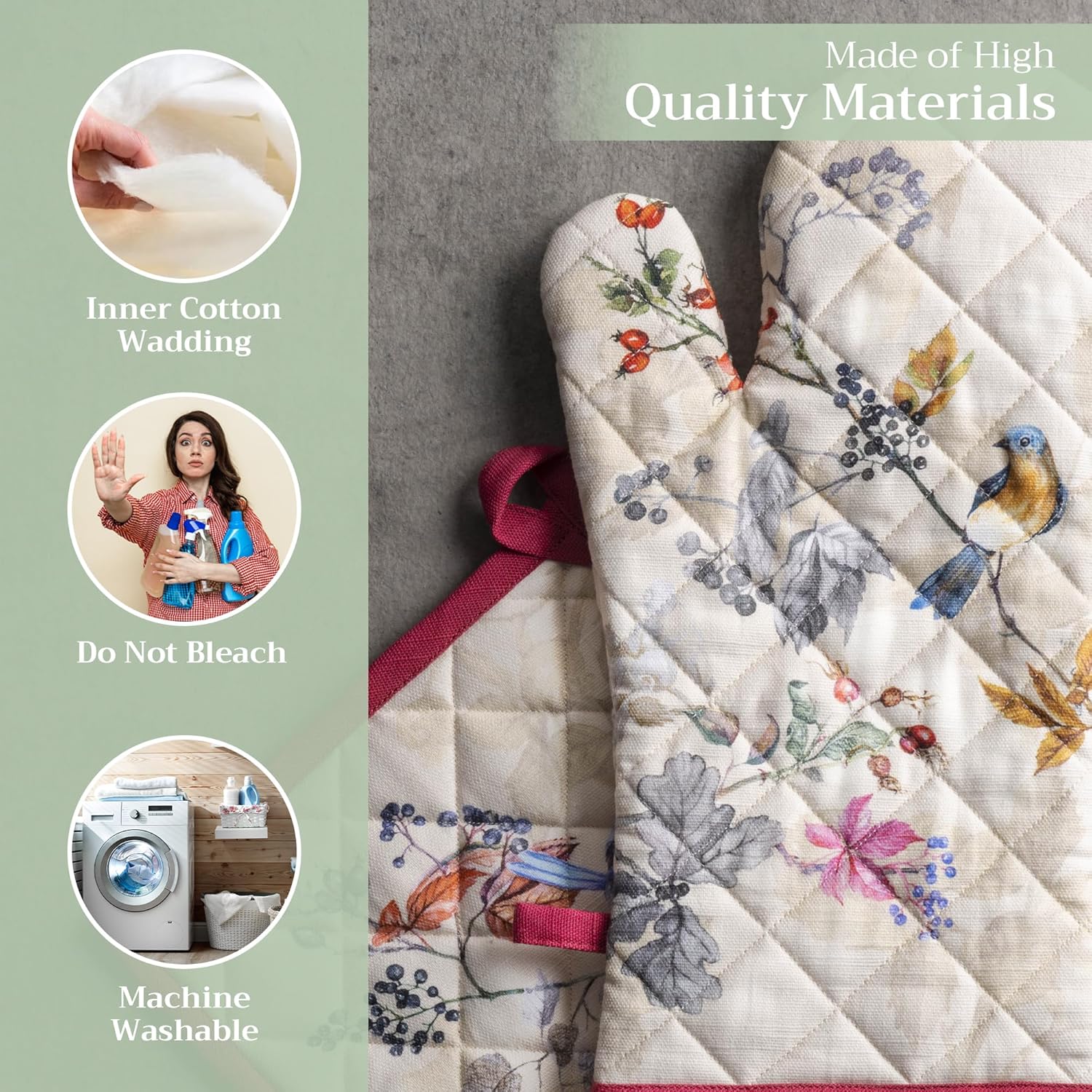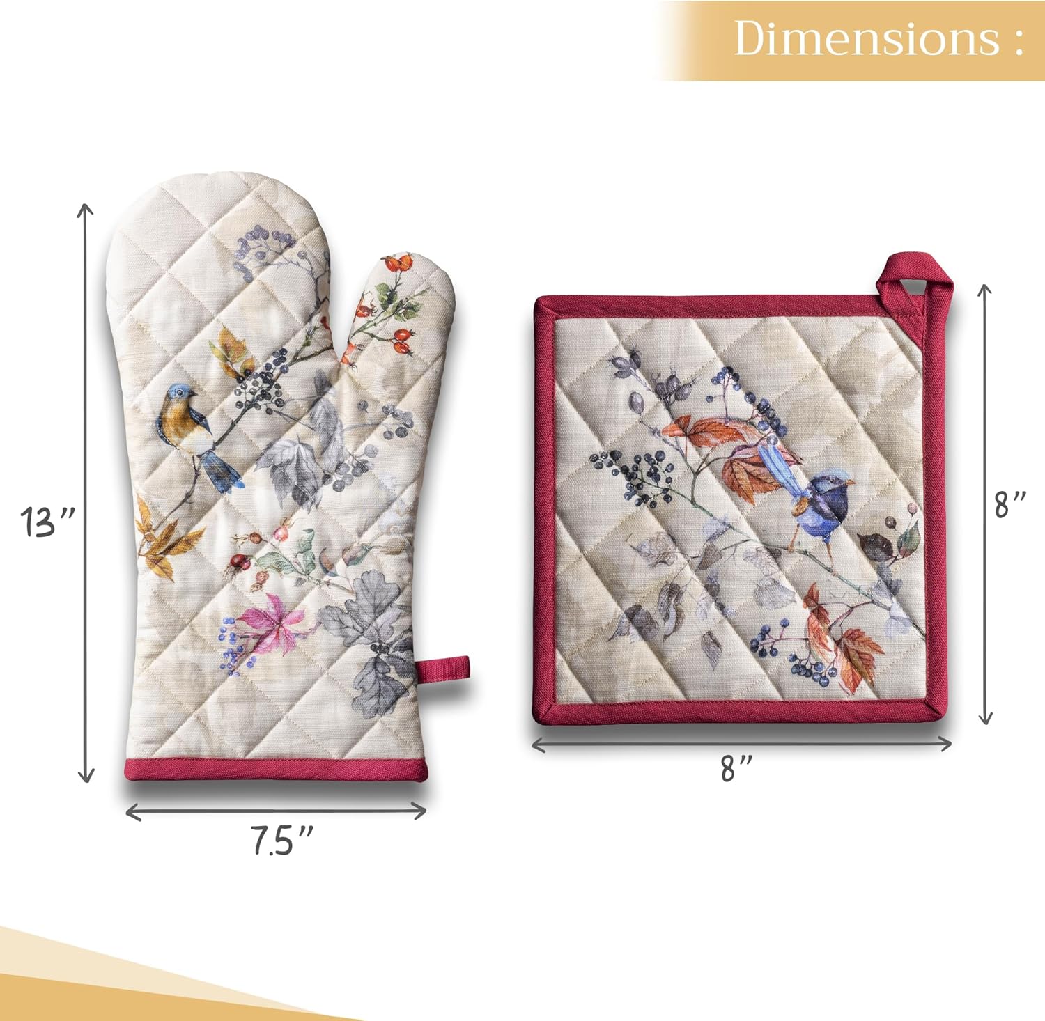 - Artistic style: Add charm to your kitchen with our oven mitt pot holder set featuring watercolor designs inspired by traditional European motifs. Stylish and functional kitchen accessories for every home cook or gift occasion.