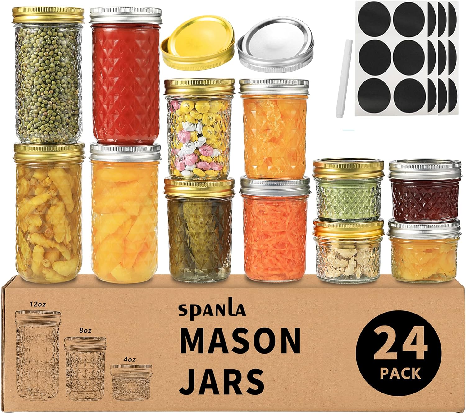 Mason Jars Canning Jars, 24 Pack Jelly Jars With Regular Lids, Ideal for Jam, Honey, Wedding / Shower Favors, DIY Magnetic Spice Jars - 4 OZ x 8, 8 OZ x 8, 12 OZ x 8 (4oz -8oz-12oz)