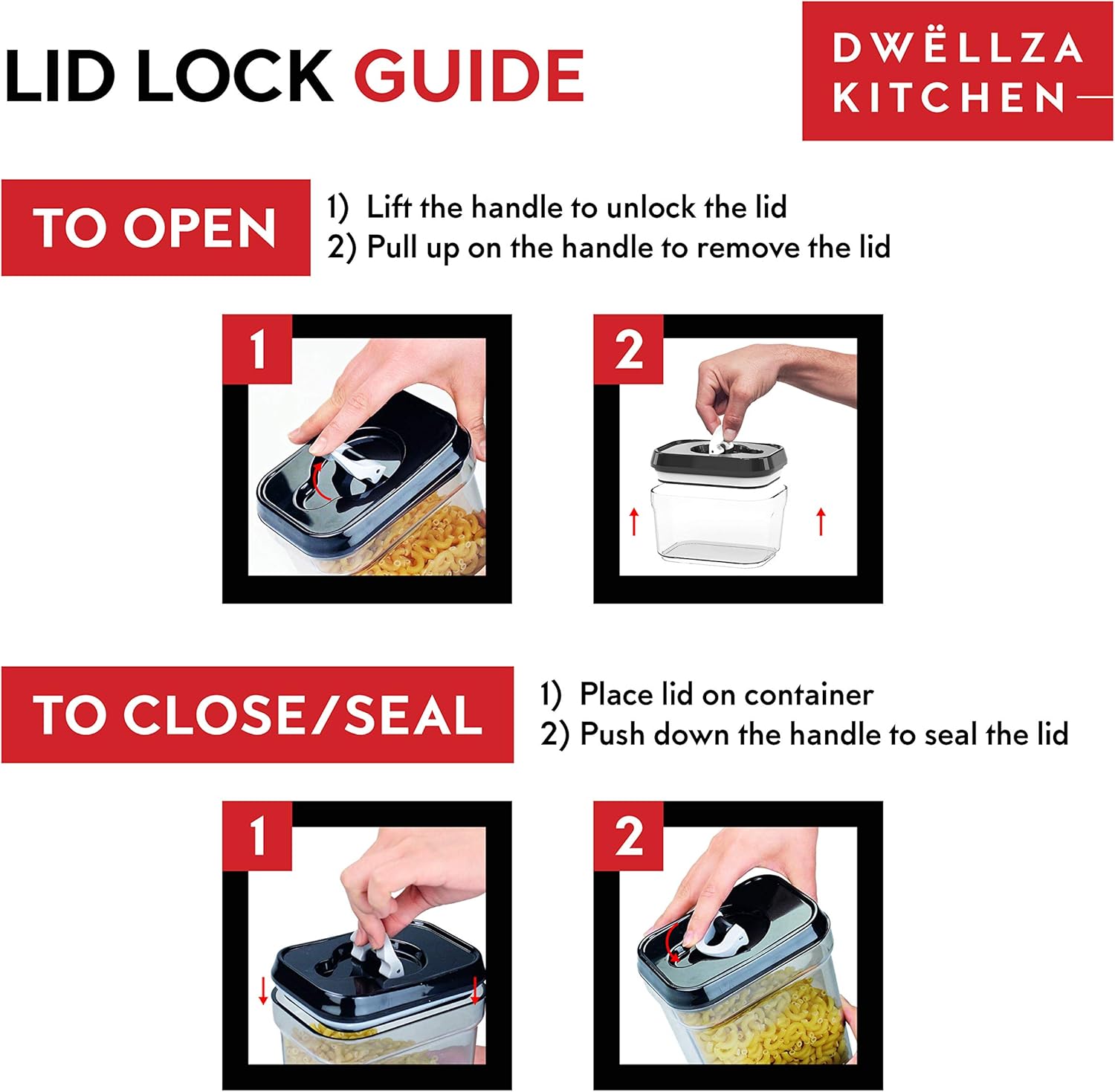 - Enjoy Your Meal With Fresh Food: Keep your food fresh with our easy-to-use airtight lid-lock mechanism. Our food storage containers create an airtight seal by simply pushing down the ring on the lid. Lift the ring and pull it to open the canisters. The airtight seal is tight enough to secure that you can even store liquids without ever worrying about leaking!