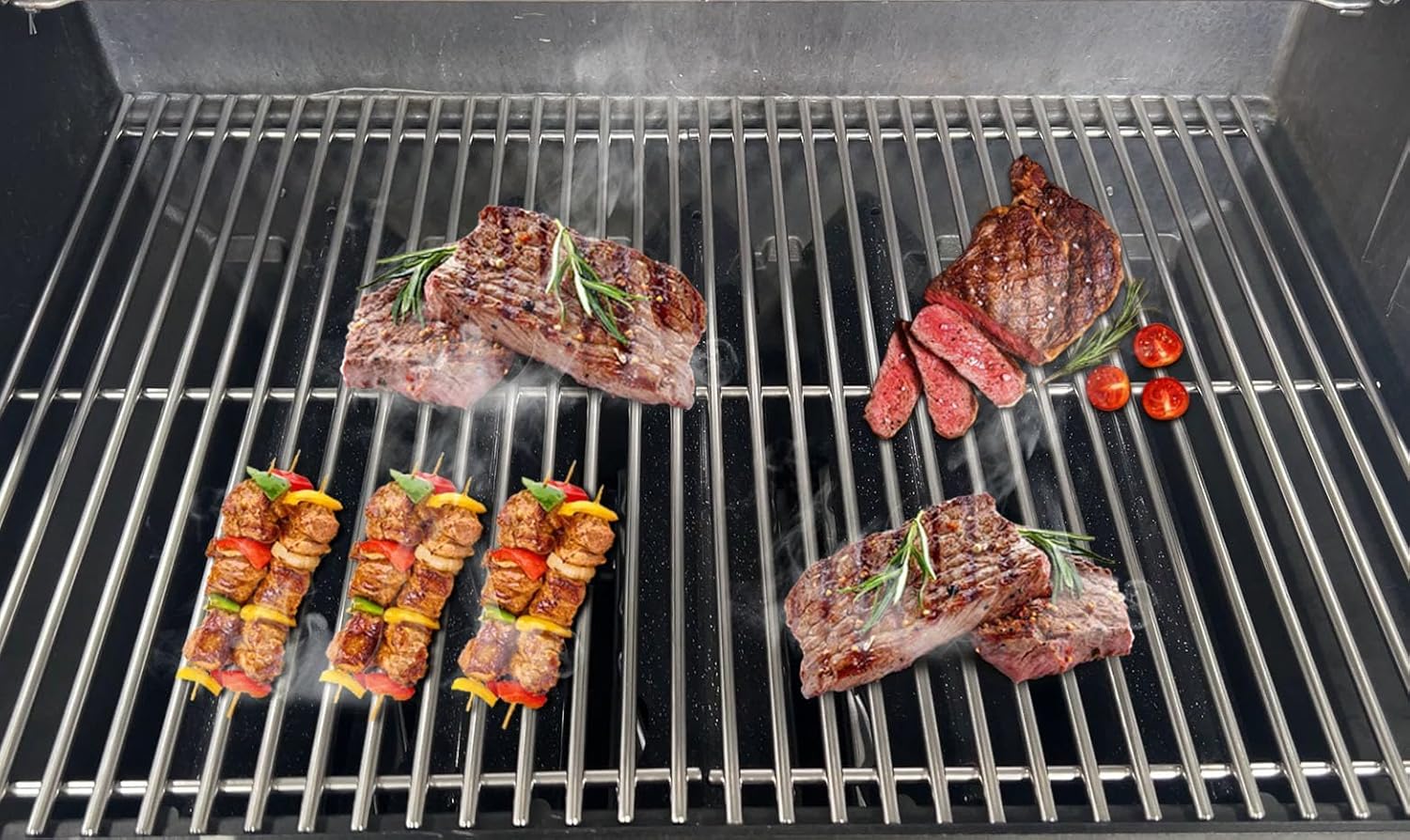 - Package includes 2-pack solid stainless steel cooking grates; Material: Heavy duty solid stainless steel: each rod diameter is 7mm( it is thicker and stronger than other traditional grill grates ). The rod of each of our grill grate is dense enough, which makes your food less likely to fall off during grilling. High quality stainless steel material, strong and durable, not easy to rust and evenly heated.