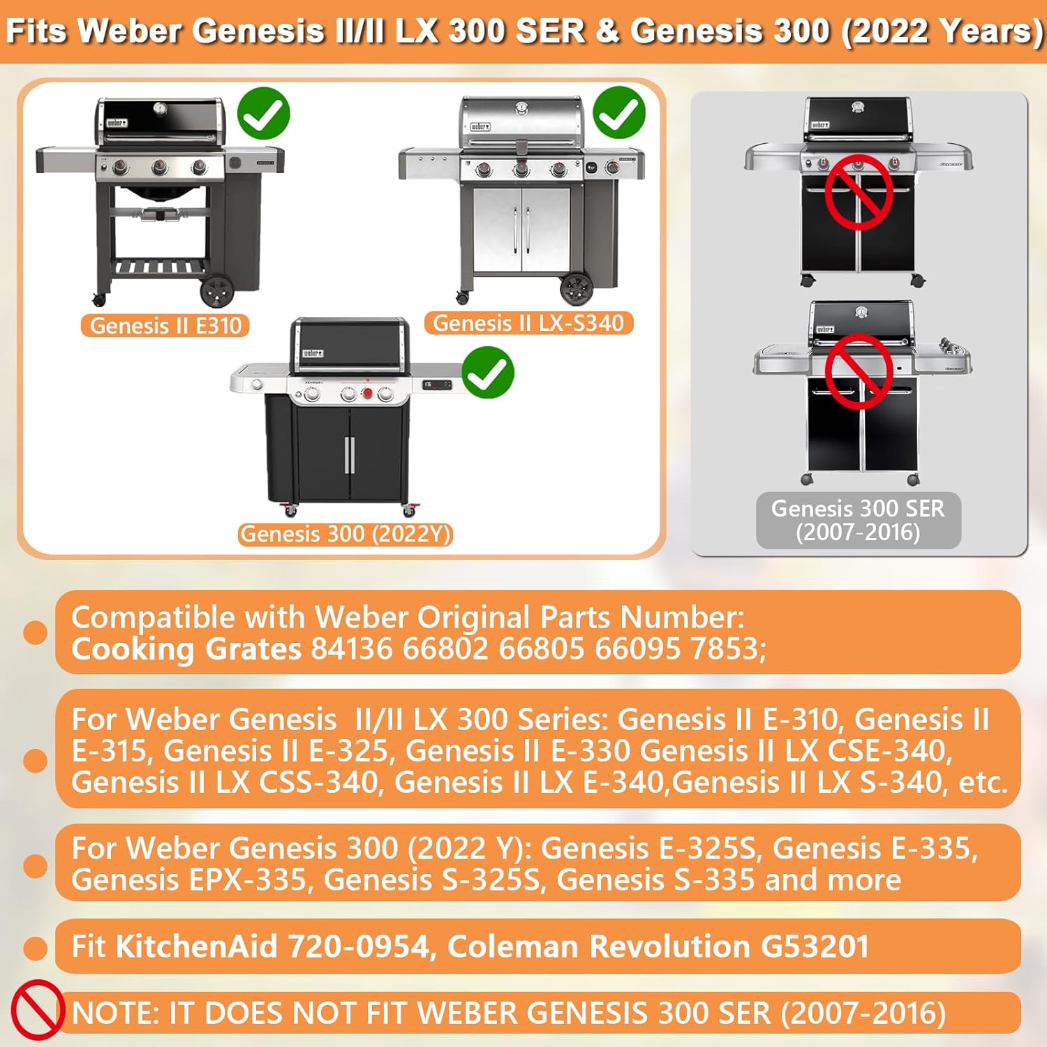 - For weber genesis ii grates replacement. Compatible with weber original part number: grill grates 66802, for weber 66805, 66095, 84136. For weber genesis ii cse-315, genesis ii css-315, genesis ii css-335, genesis ii cse-335. Fit Weber Genesis II LX 300 Series gas grill: for Weber Genesis ii LX S-340, Genesis ii LX E-340, GENESIS II EX-335, genesis ii lx css-340, genesis ii lx cse-340, genesis ii ex-335 smart grill, genesis ii ex-315 smart grill.