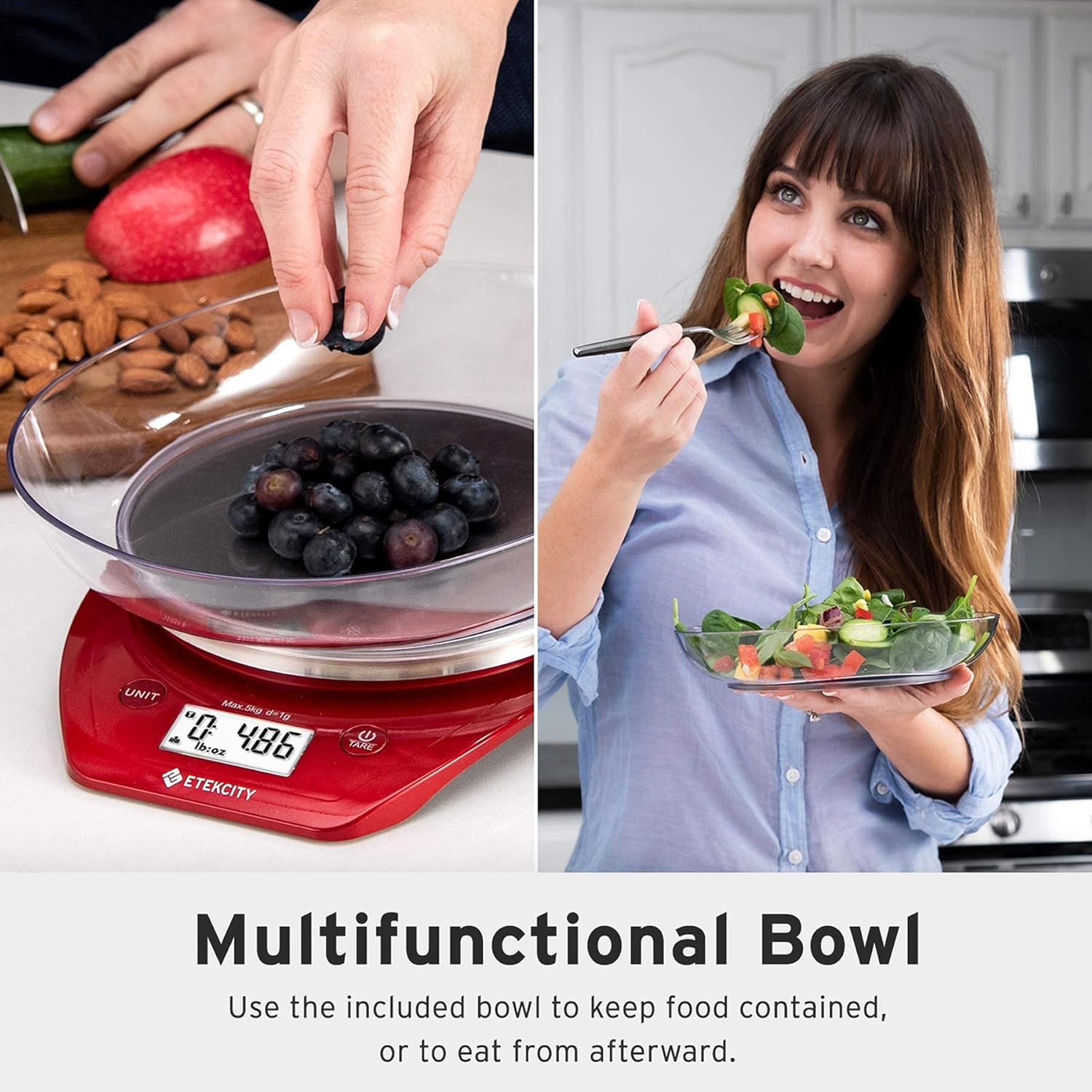 Etekcity 0.1g Food Kitchen Scale, Bowl, Digital Grams and Ounces for Weight Loss, Dieting, Baking, Cooking, and Meal Prep, 11lb/5kg, Stainless Steel Red