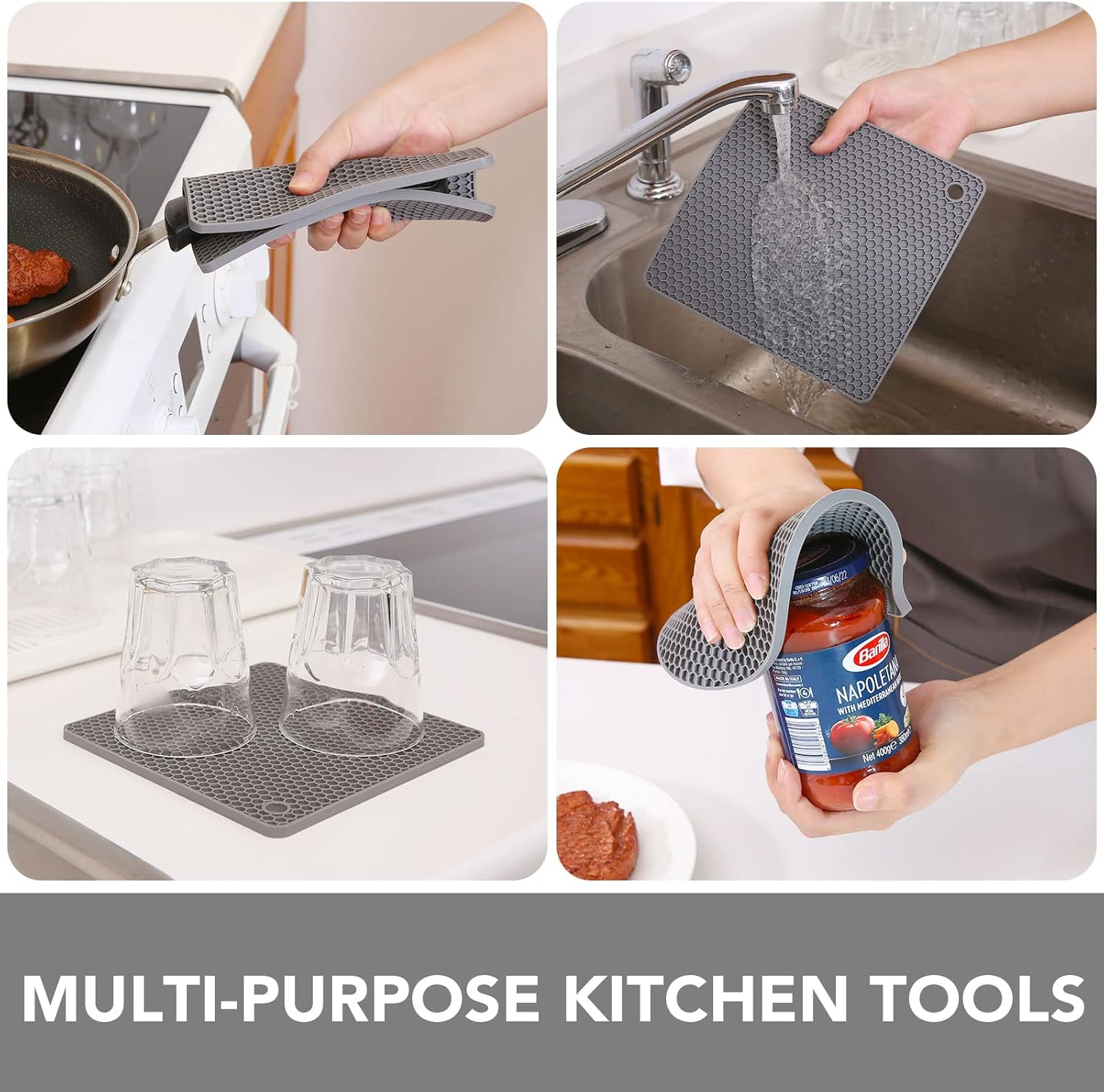 - MULTI-PURPOSE KITCHEN TOOLS - Each trivet has a corner hole for convenient hanging storage and can be used as a coaster, drying mat, jar opener gripper pad, spoon holder, garlic peeler, and potholder mat.