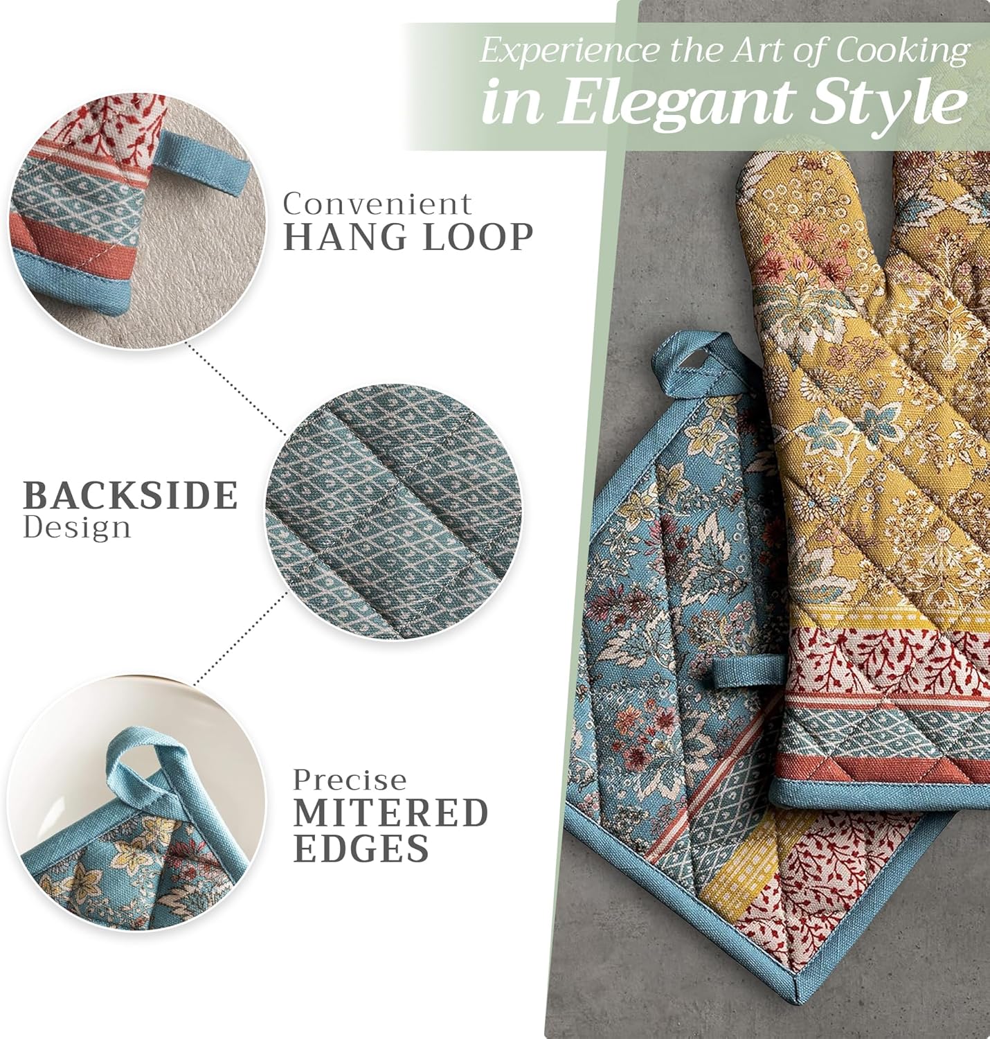 - Artistic style: Add charm to your kitchen with our oven mitt pot holder set featuring watercolor designs inspired by traditional European motifs. Stylish and functional kitchen accessories for every home cook or gift occasion.