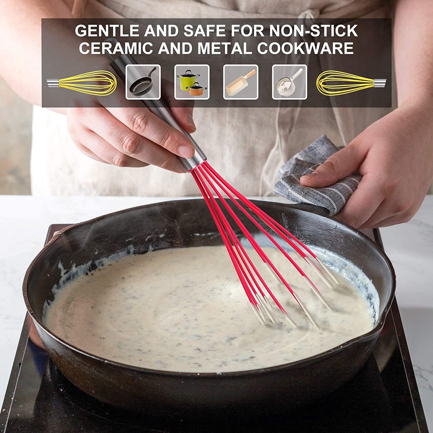 - 484ºF High Heat-Resistant: Feature BPA free silicone wires. 1.65mm thickened wires coated in 0.3mm soft silicone makes it stronger and more durable. Great for stirring sauces and gravies while heating.
