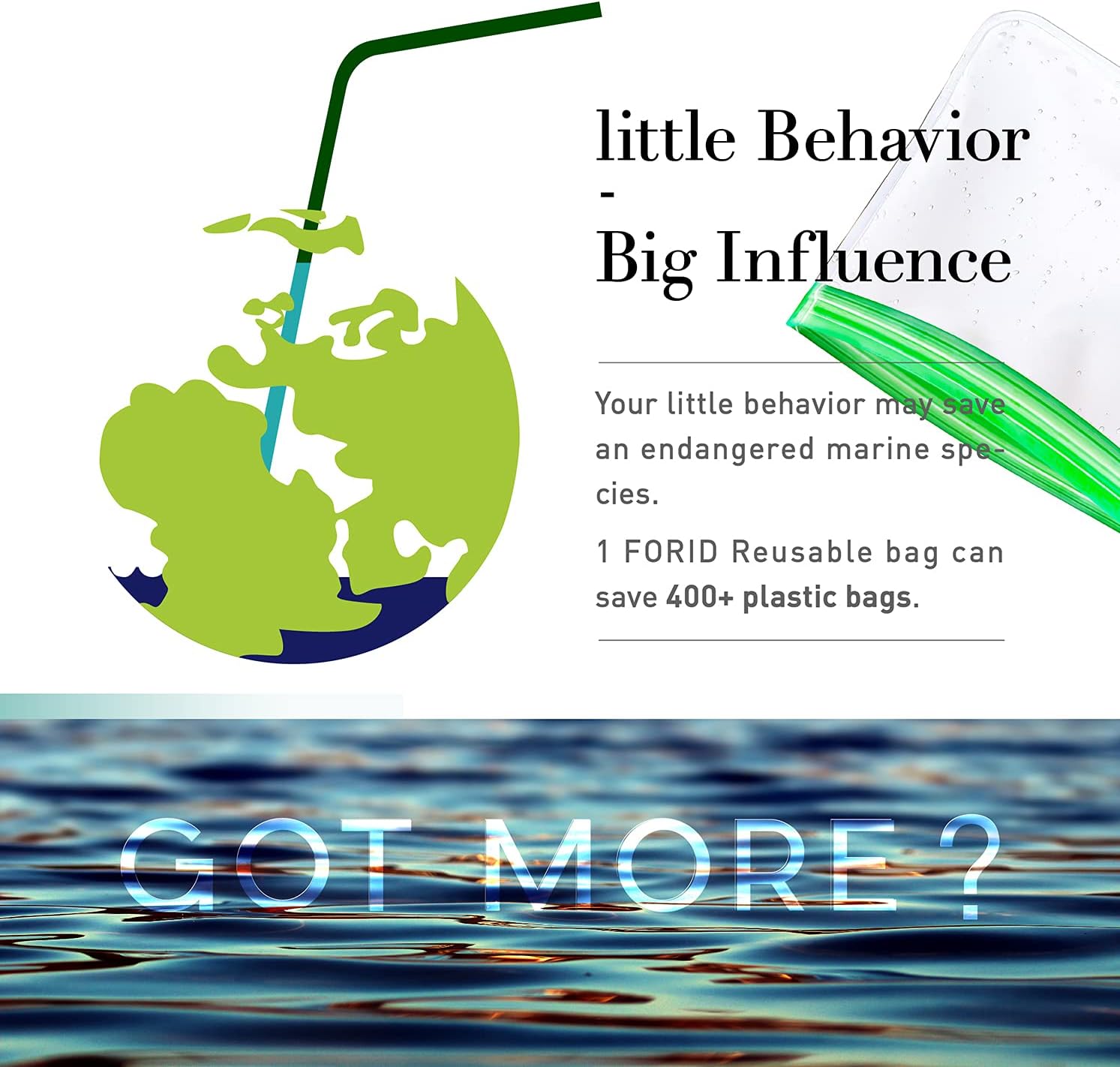 - Food Grad Material - Adopted upgrade food-grade material, FORID reusable storage bags are plastic-free and eco-friendly, meaning our reusable food storage bags are harmless to the environment when disposed or burned. Each reusable freezer bag is reusable for hundreds of times, saving up to 400+ disposable plastic bags, which not only can protect our earth, but also save our money.