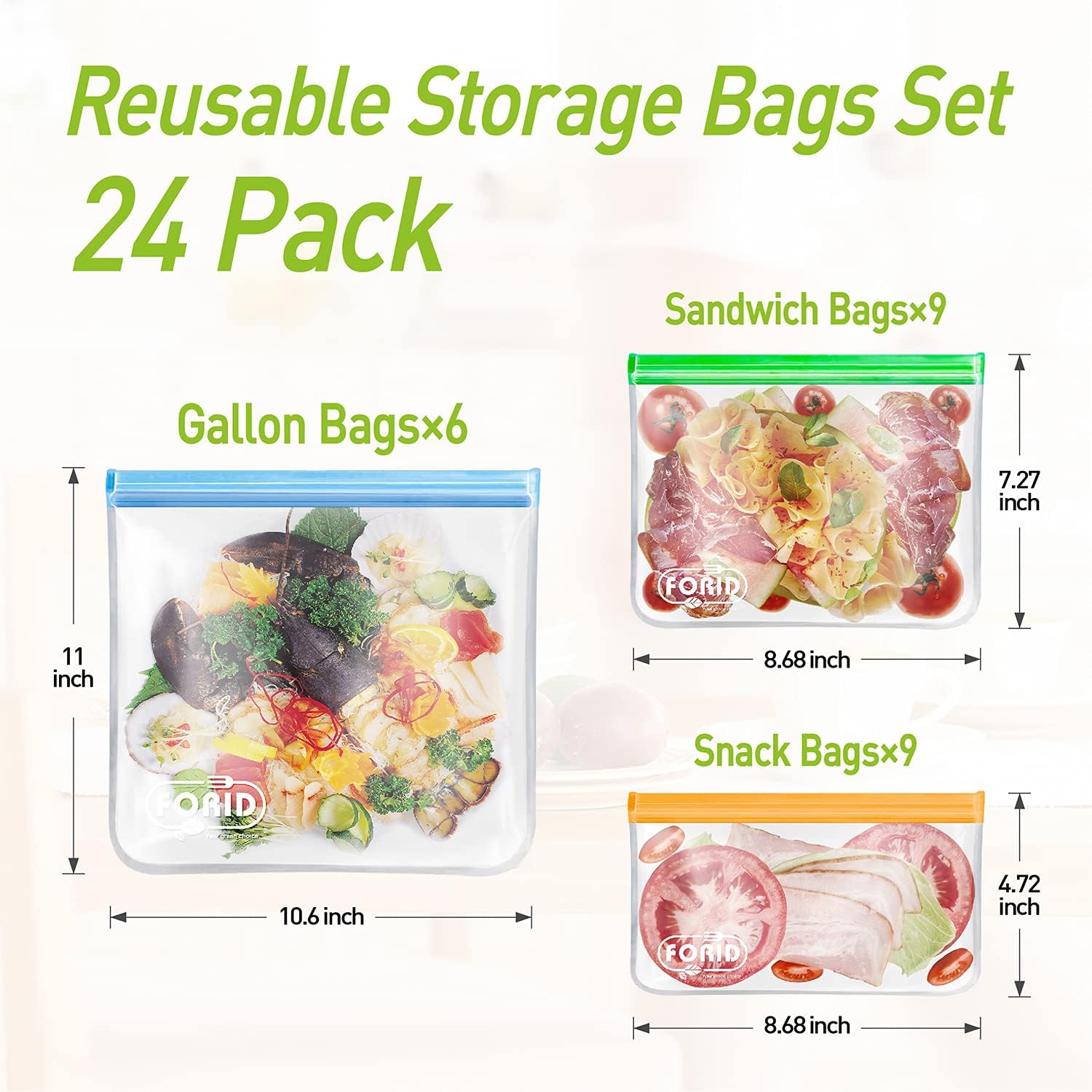 FORID 24 Pack Reusable Food Storage Bags, Silicone Gallon Freezer Bags, Sandwich Snack Resealable Lunch Bags, Extra Thick Leakproof for Marinate Food, Fruit Cereal Travel Items Home Kitchen