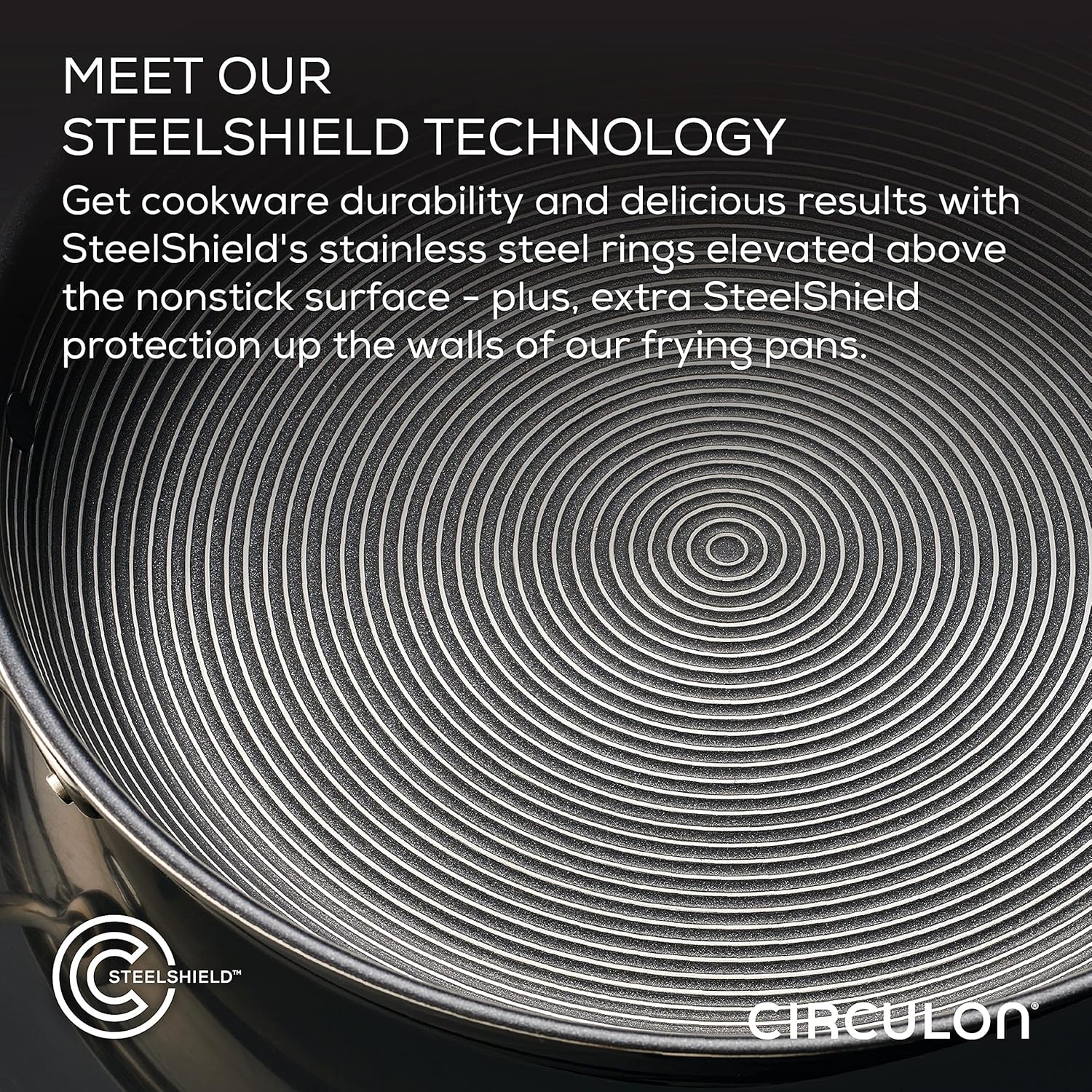 - WHAT IS STEELSHIELD: Circulon SteelShield pots and pans are the first to feature stainless steel circles raised above a premium nonstick finish for the most versatile and durable cookware surface yet. Use any kitchen spoon or spatula on hand to flip, fry, and even scrape the innovative SteelShield rings. On our frying pans, the rings extend up the side walls for even more surface protection. Metal utensils? Bring it on.