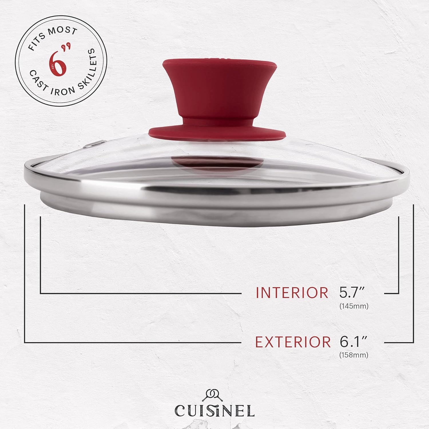 Cuisinel Glass Lid with Steam Vent Hole - 6"-Inch/15.24cm - Compatible with Lodge Cast Iron Skillet Pan - Fully Assembled Universal Replacement Cover - Tempered, Oven Safe - Reinforced Stainless Rim