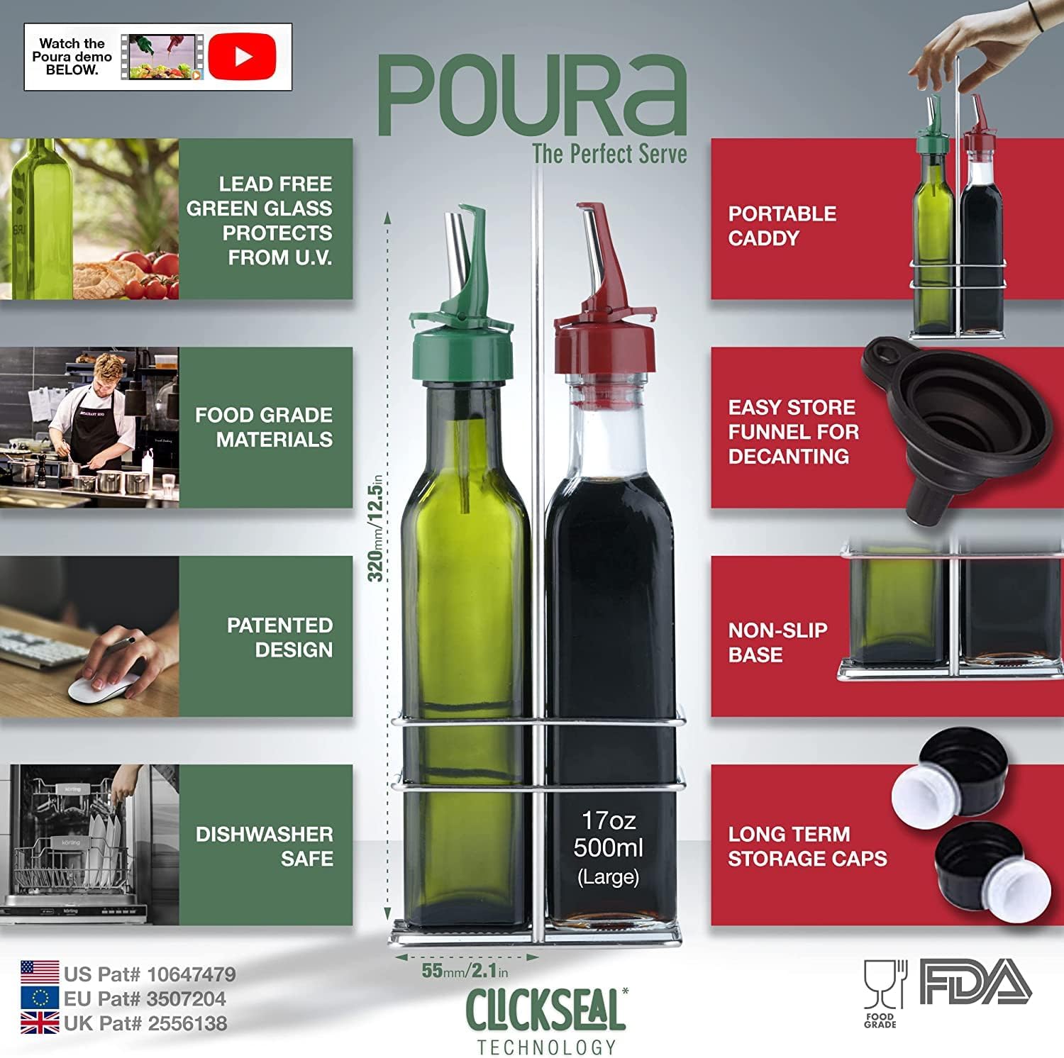 - ✅ HYGIENIC & DUST FREE DESIGNED POURERS - Our built in airtight dust caps mean a hygienic seal & no more lost caps - Ever. Our patented Advanced ClickSeal pourers ensure hygienic operation for every use. Handy portable stainless steel caddy for easy use & storage, keeping your oil and vinegar fresher, longer.