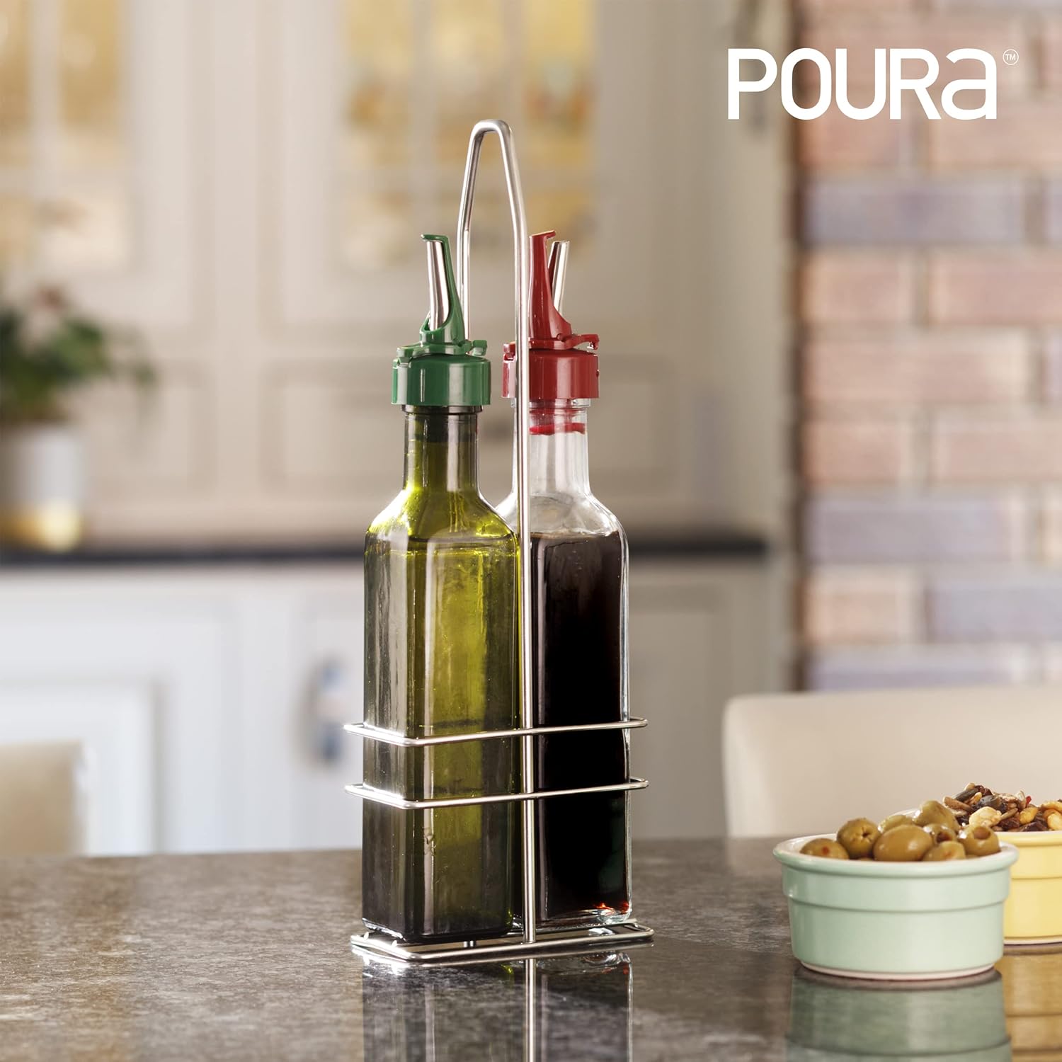 - ✅ TRANSFORM YOUR KITCHEN WORKFLOW - Poura's Advanced ClickSeal Technology Pourers are designed by a top chef & product designer team to look attractive in your kitchen & work for you while cooking - built to last with industrial quality materials. Both elegant & easy to use with a non-slip base for extra security for your olive oil and vinegar dispenser set.