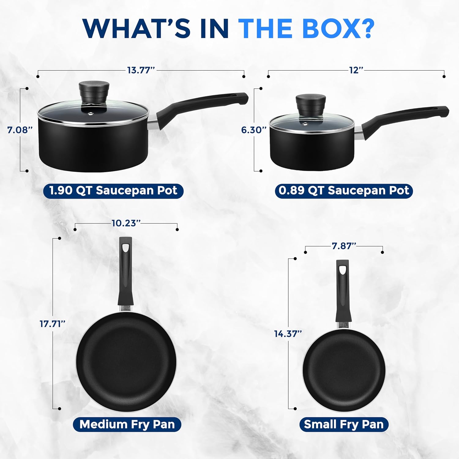 - 6-PIECE SET: The SereneLife Home Basic Kitchen Cookware Set features a 6-piece nonstick cookware set which includes 0.89 quart and 1.90 quart sauce pots with lids, 8-inch small fry pan, and 10-inch medium fry pan