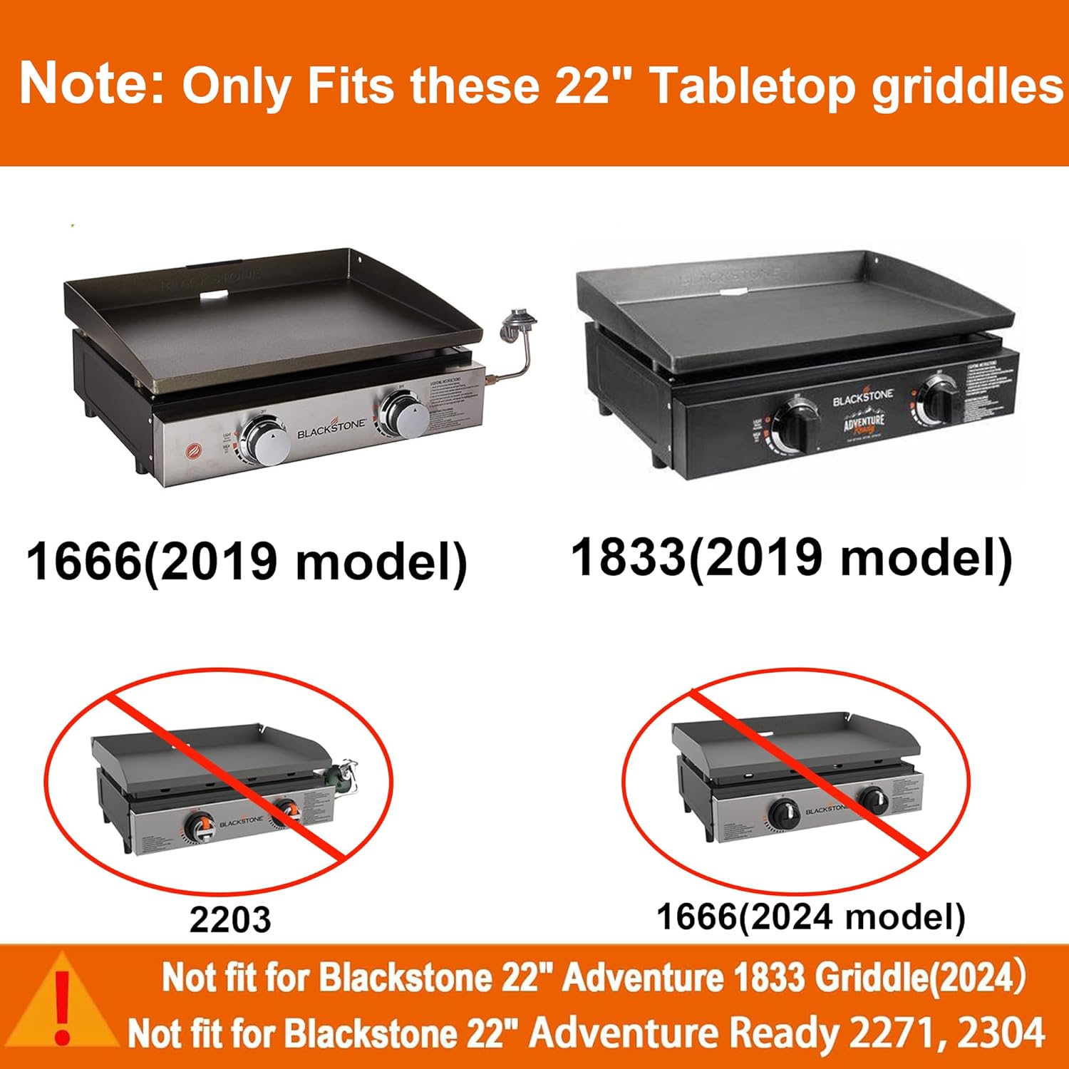 - NOTE: Not fit for Blackstone 22" Adventure 1833 Griddle(2024), Adventure Ready 2271, 2203, 2304 and 22 inch omnivore griddle 1666 (2024 Year Model)