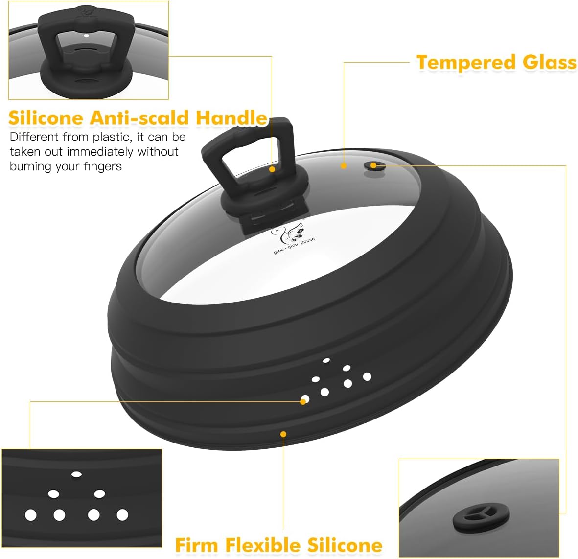 Microwave Splatter Cover Vented Glass Splatter Guard Lid with Collapsible Silicone for Food as Pot Cover Plate 10.8 inch for 6 7 8 9 10 inch Plate Bowl
