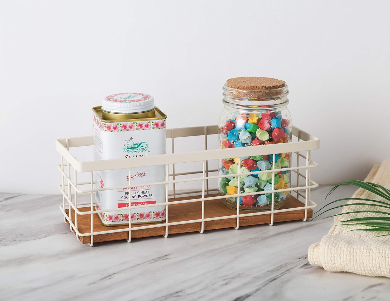 TIEYIPIN Small Metal Wire Storage Basket, Detachable Wood Base Storage Organizer Bin Basket for Kitchen Cabinets, Bathroom, Pantry, Garage, Laundry Room (Cream White, 2 Pack)