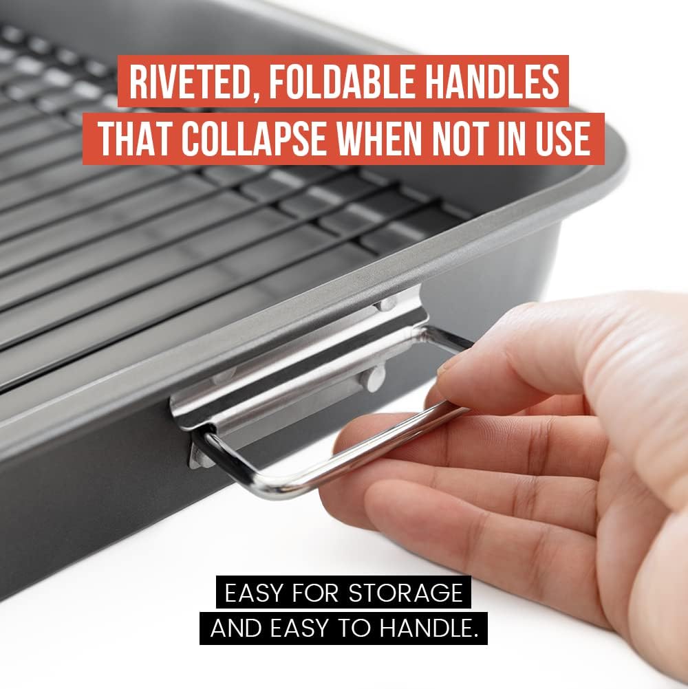 - ✅ NON-STICK COATING: No worries about half your meal getting stuck to the pan's bottom! This pan and baking rack for oven cooking is mess-free and easy to clean. Remove the rack and use as a regular baking pan for brownies and other baked goods.