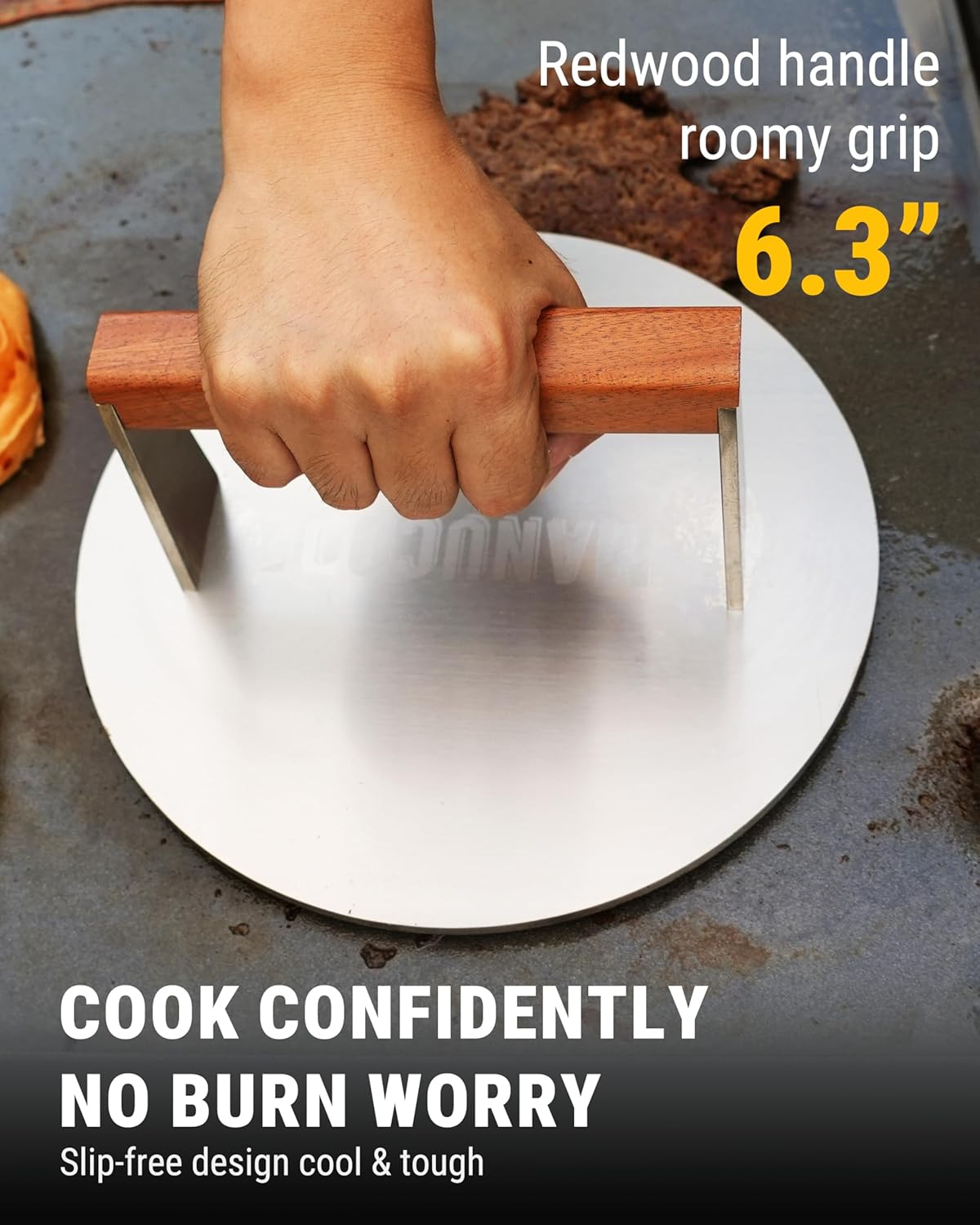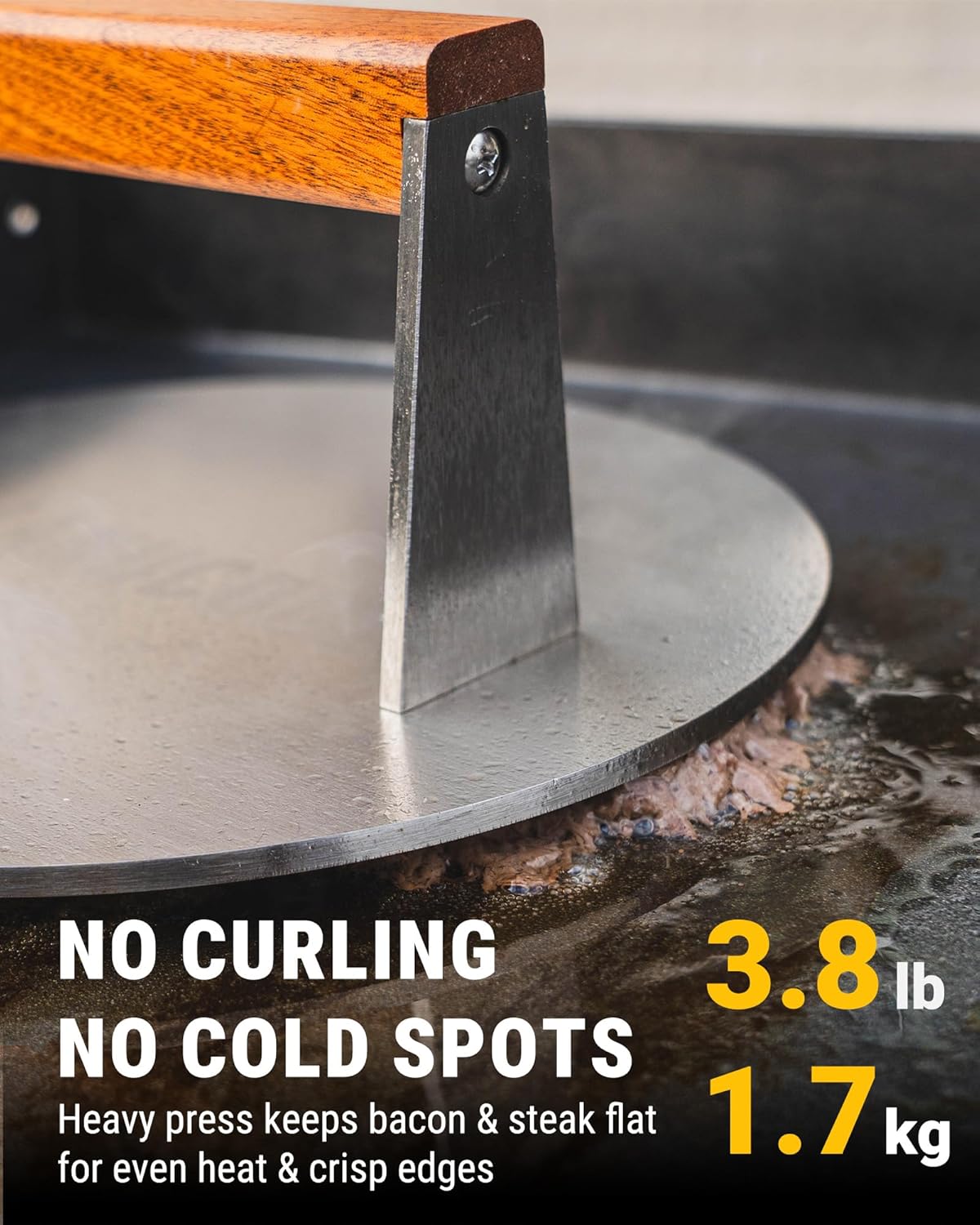 - SAFETY FIRST IN THE KITCHEN: Our griddle press features an extended anti-rotation wooden handle, keeping you cool and safe even during long cooking sessions