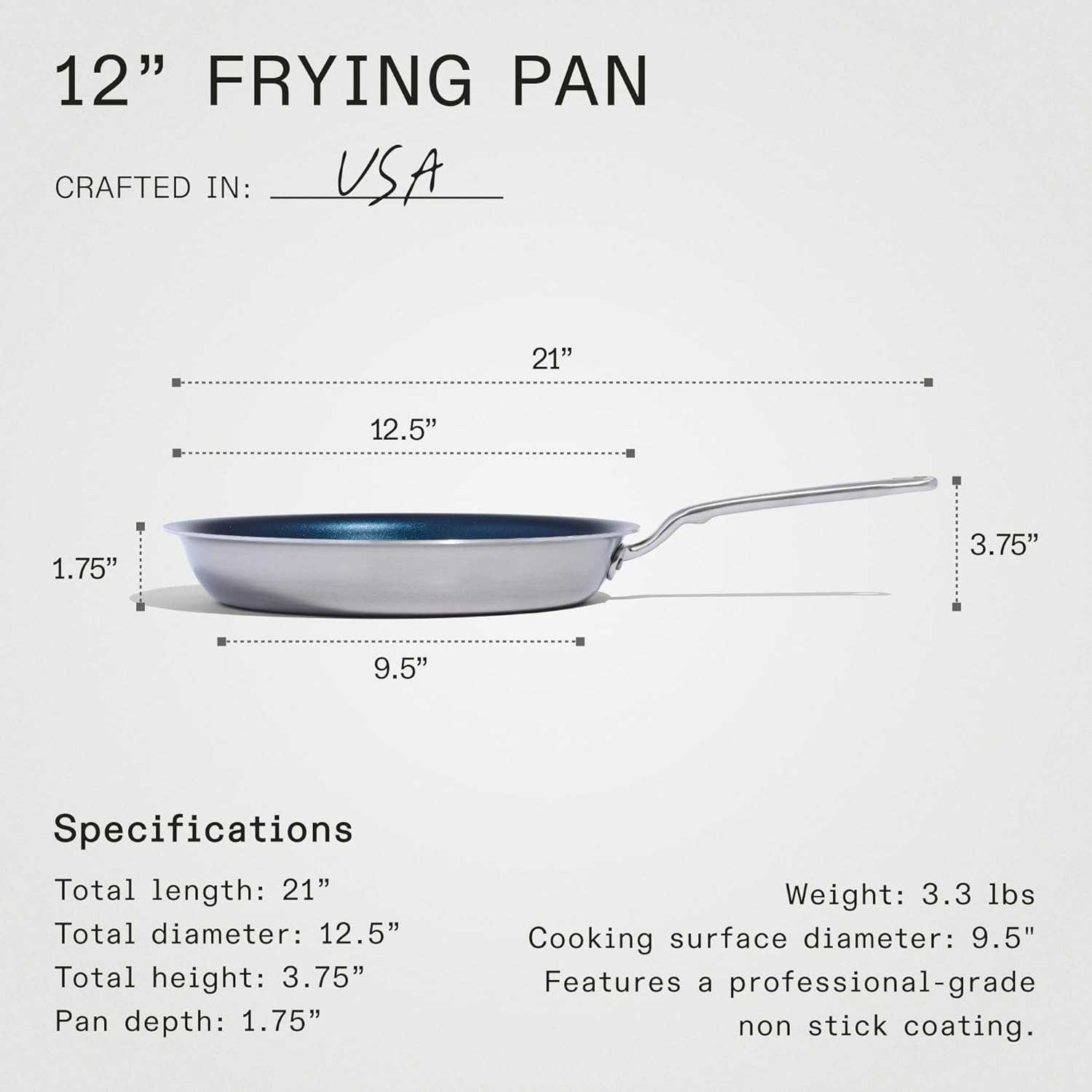- Total Diameter: 12.5” | Cooking Surface Diameter: 9.5” | Total Height (with handle): 3.75” | Depth: 1.75” | Length (with handle): 21"
