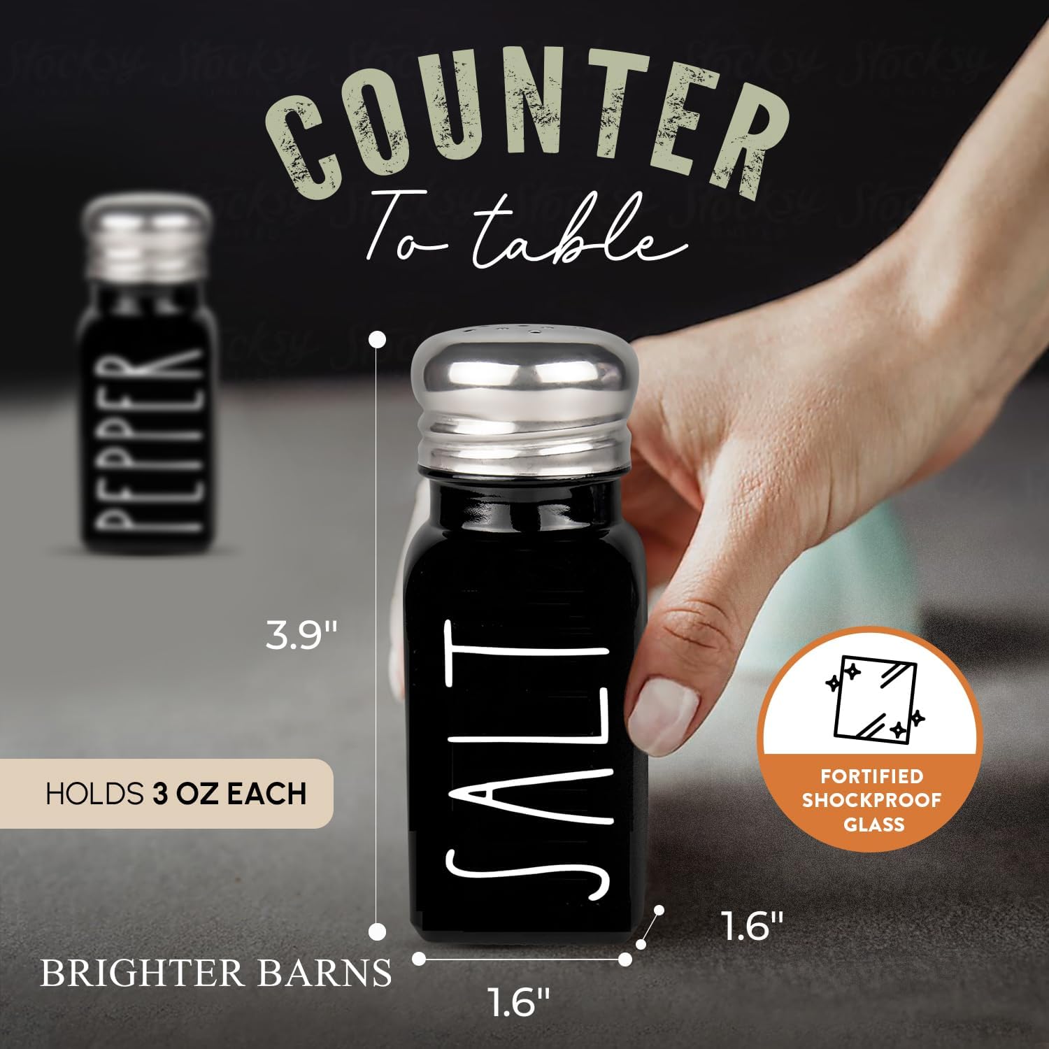 - SUPER CUTE FARMHOUSE DESIGN - Charm your friends and family with your new cute black salt and pepper shakers. Each spice shaker is crafted from premium glass and fits perfectly with any black kitchen decor, farmhouse decor, or black decor. Protected by U.S. Design Patent D1050816.