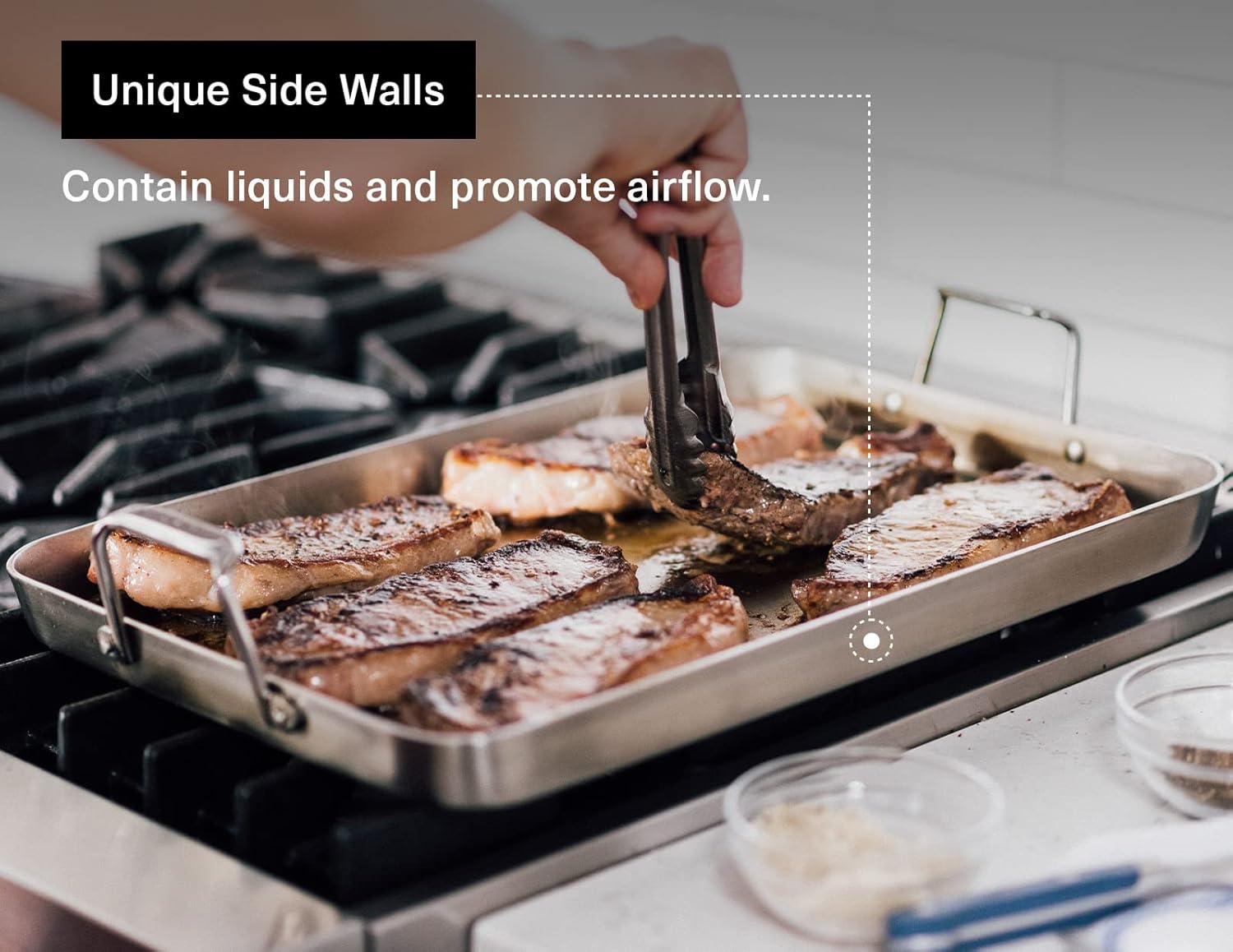 - Smart Side Walls: The genius design of this roasting tray lies in its perfectly balanced side walls. Tall enough to corral savory liquids, yet strategically short to foster the ideal airflow for achieving impeccable browning and baking results. It's the sweet spot for hassle-free cooking.