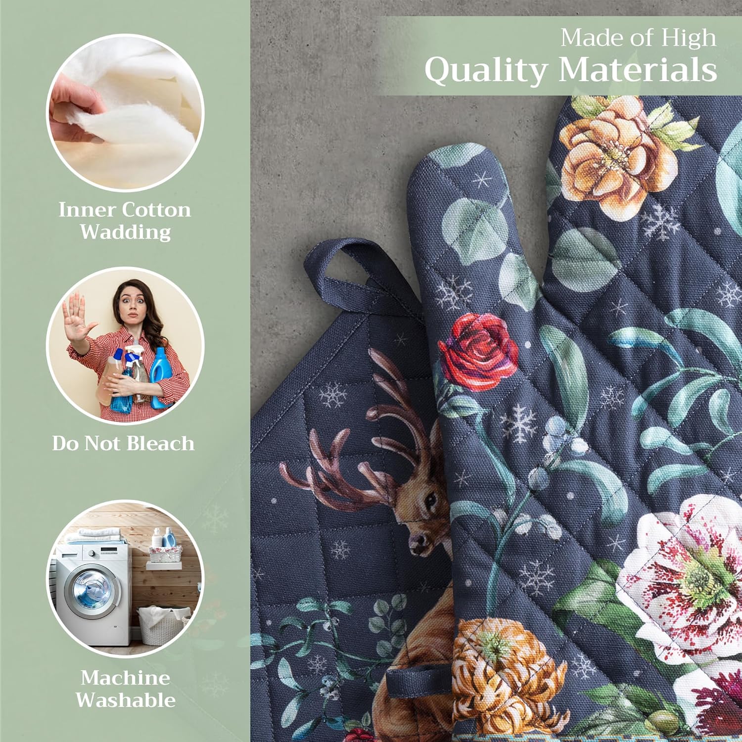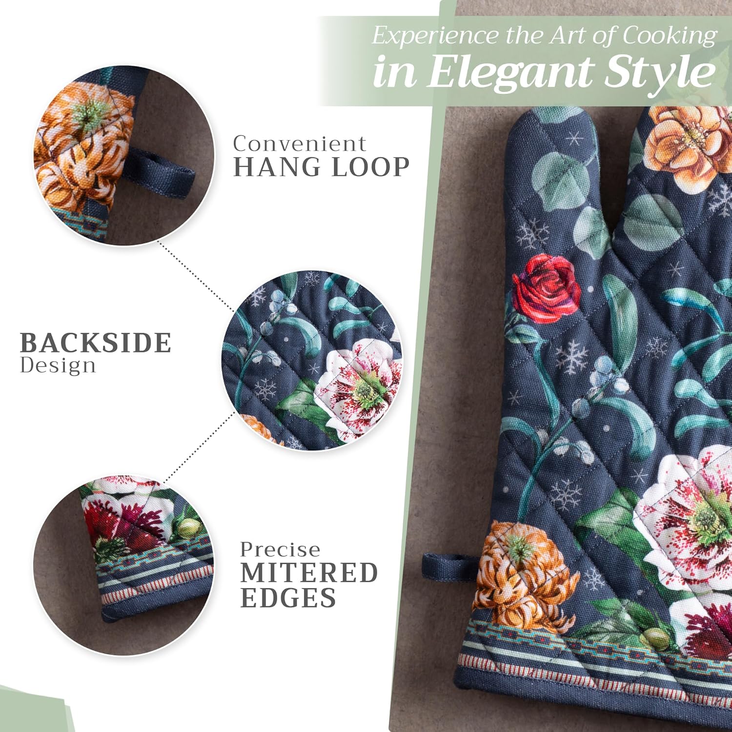 - Artistic style: Add charm to your kitchen with our oven mitt pot holder set featuring watercolor designs inspired by traditional European motifs. Stylish and functional kitchen accessories for every home cook or gift occasion.