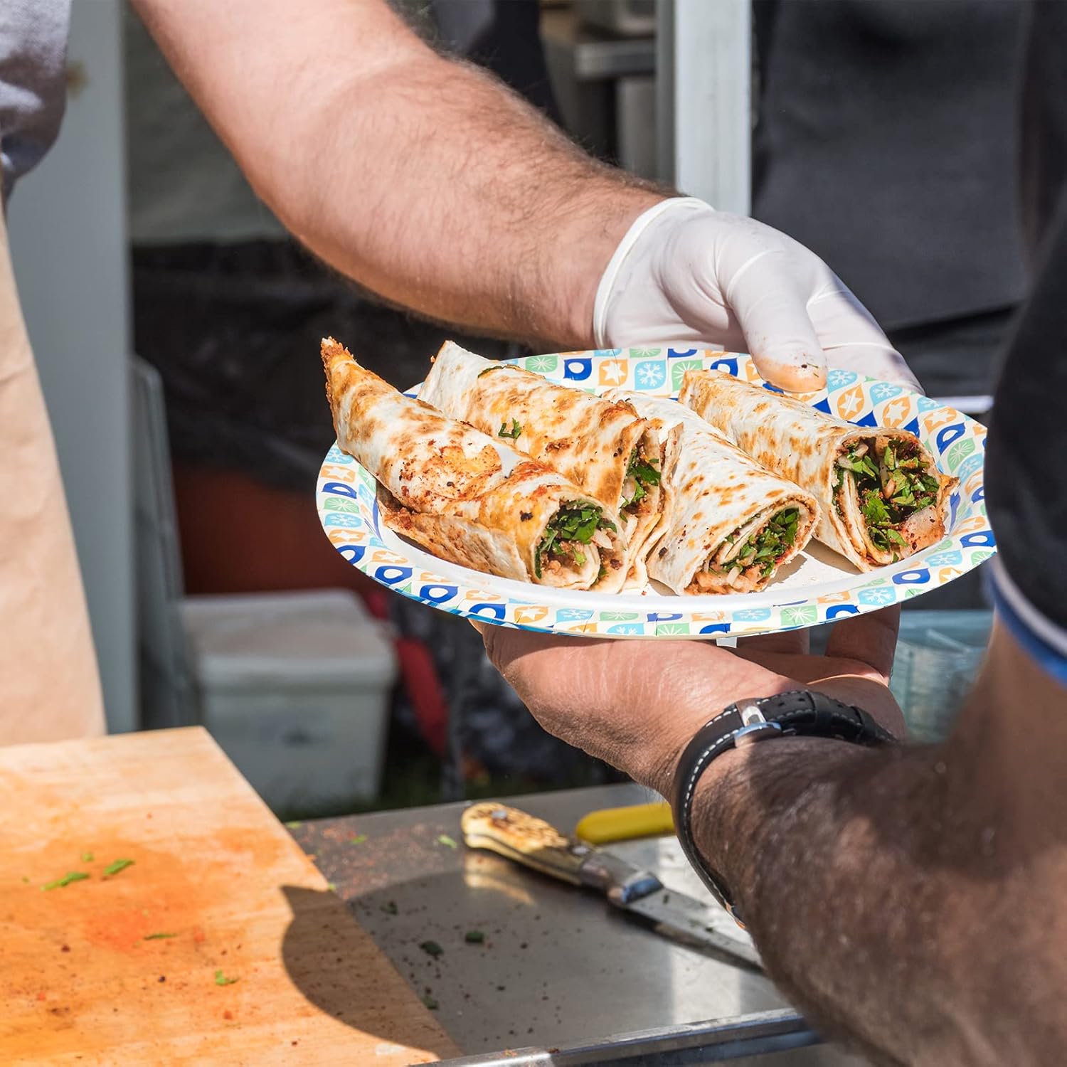 - Design: Large paper plates can be filled with your favorite food. from breakfast to dinner, or snacks, desserts, hamburgers, fruit, and pasta dishes