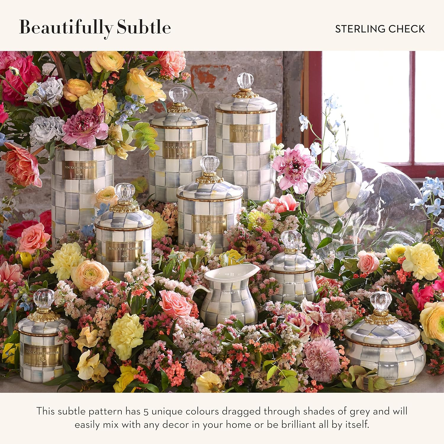- KITCHEN DECOR ESSENTIAL: Our Sterling Check kitchen utensil holder is an ideal kitchen container with an iconic pattern. It features a palette of color-dragged checks in subtle shades of gray that will complement a whimsical cooking space.