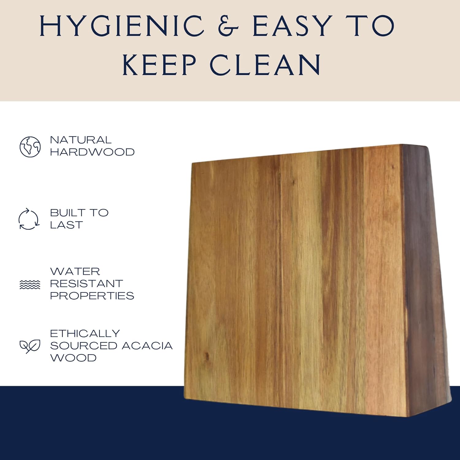 - UPDATE YOUR BENCHTOP WITH NATURAL BEAUTY Crafted from certified sustainable Acacia wood, each hand-finished block features unique grain patterns and a smooth, satin varnish. A minimalist showpiece that makes a thoughtful gift for anyone who loves to cook
