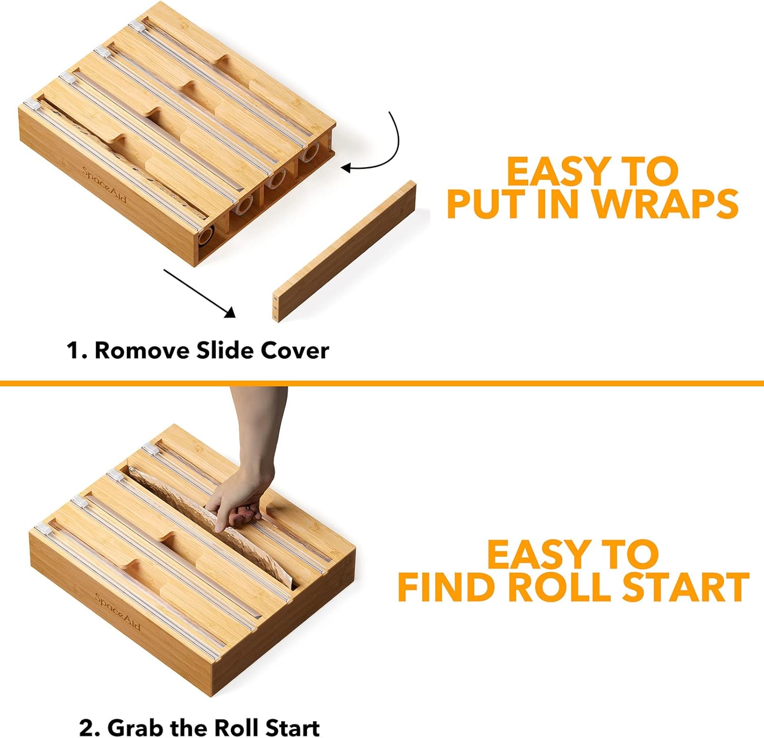 - ORGANIZED AND BEAUTIFUL - Make your kitchen storage neat and organized with this bamboo wrap organizer dispenser holder box. The aluminum foil organizer is designed for your different wraps kitchen storage organization accessories; SIZE: 14" L x 11" W x 3" H