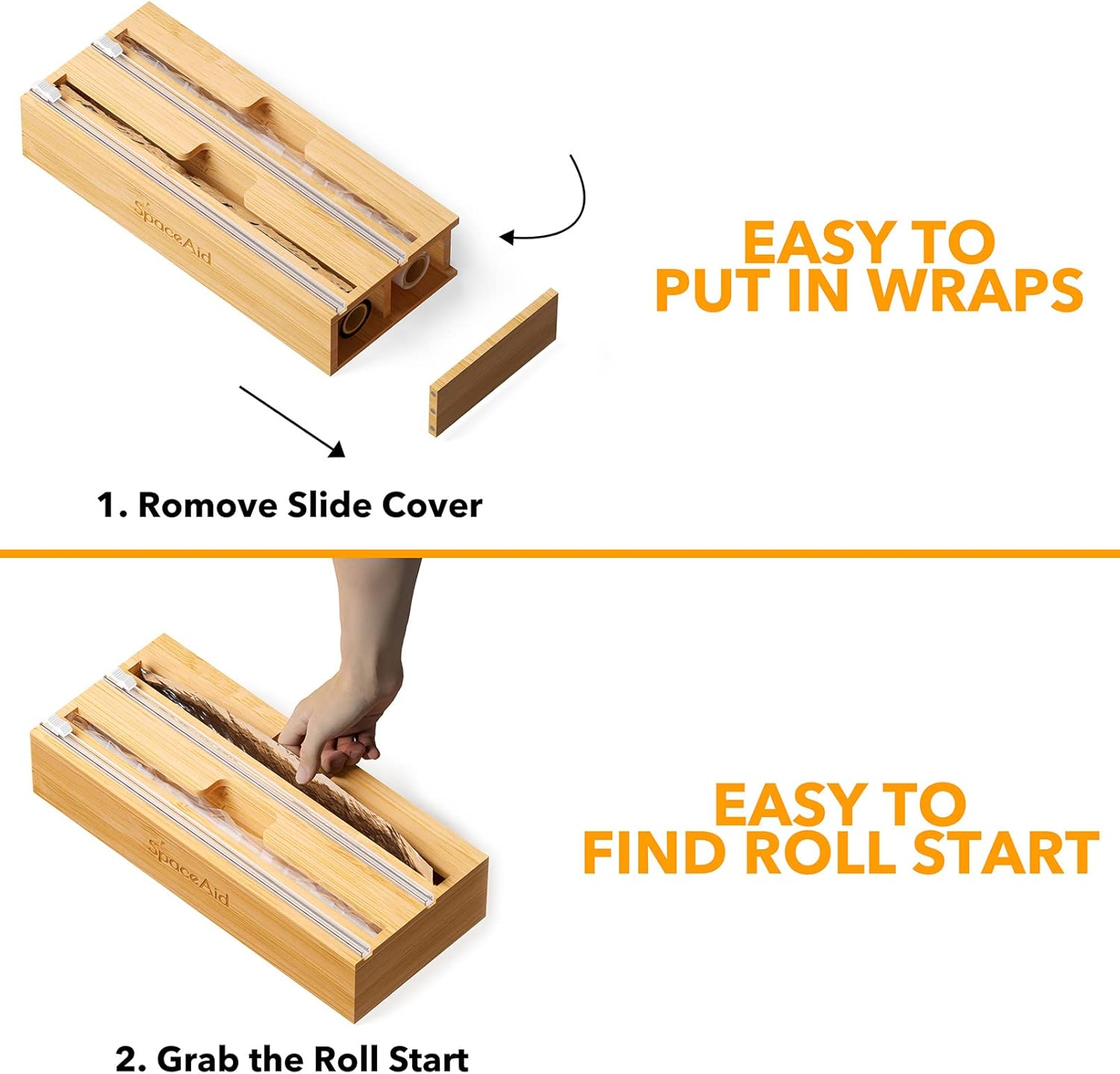 - ORGANIZED AND BEAUTIFUL - Make your kitchen storage neat and organized with this bamboo wrap organizer dispenser holder box. The aluminum foil organizer is designed for your different wraps kitchen storage organization accessories; SIZE: 14" L x 5.7" W x 3" H