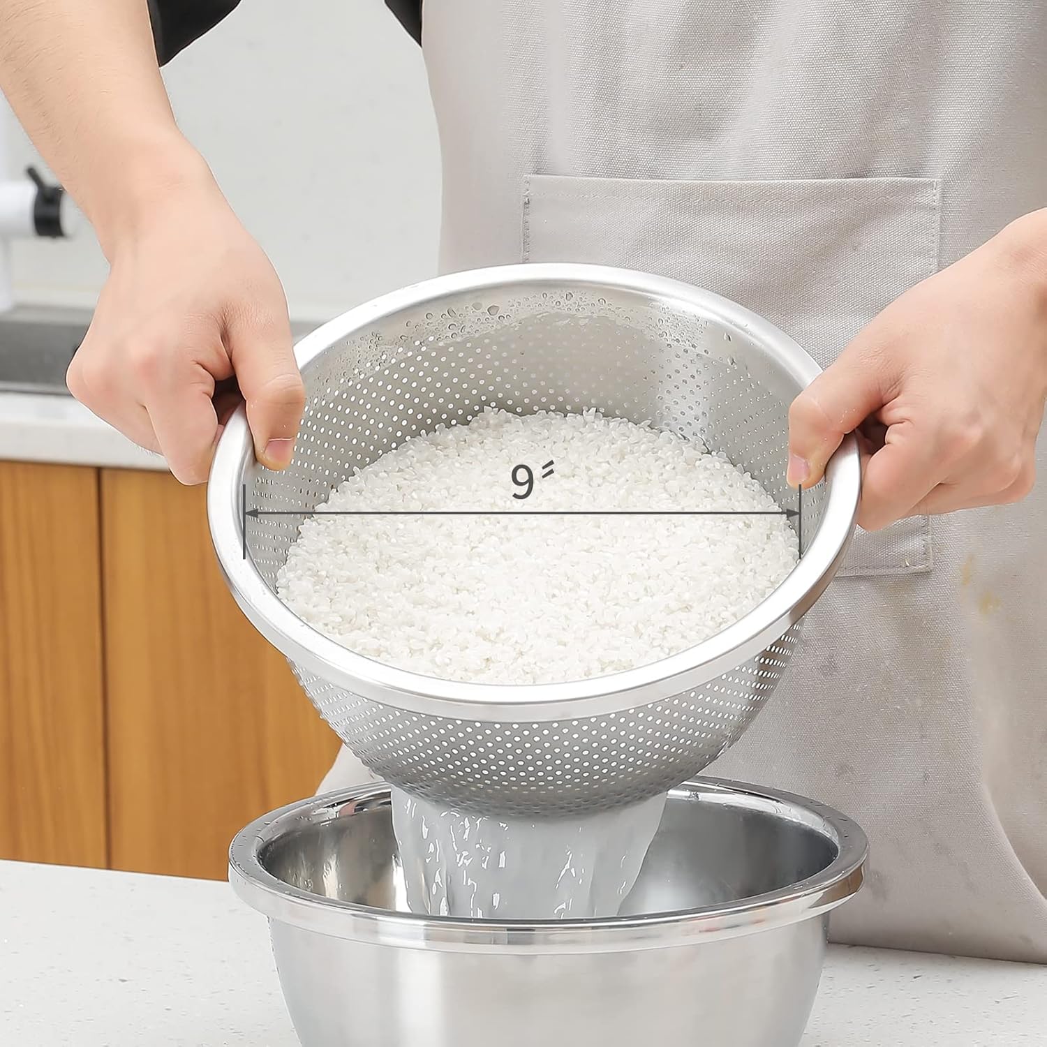 - Colander is made of 304 food grade material, which is safe, healthy and durable. Drainage hole is 2mm in diameter, rice/bean/lentil will not overflow.