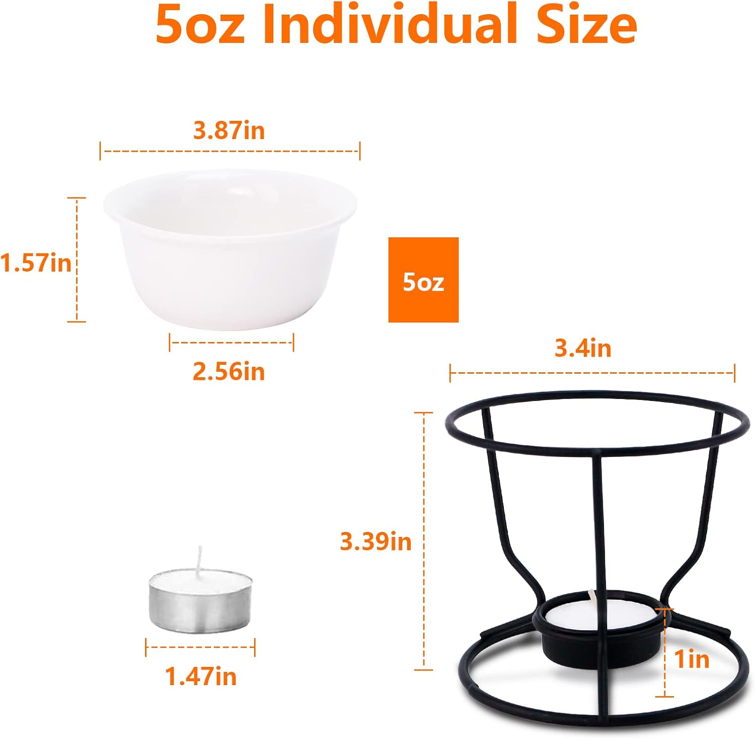 - 5oz Individual Sweet Bowl with Decent Size: Luvan 4Pcs Fondue Pot Set with 20 Tea light candles for free. Each bowl measure 3.87inch top diameter and 1.57inch height,with 5oz(150ml) large capacity. The metal stand is 3.39inch height.Stackable design did not waste space in the cupboard.
