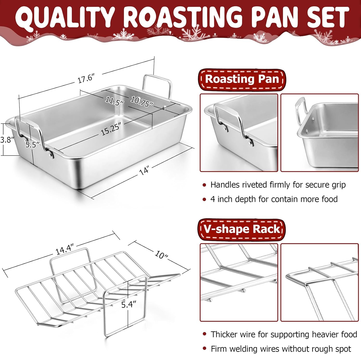 - 【LARGE & DEEP PAN】 The roasting pan measured 15.3’’L x 11’’W x 4’’H, Large enough to support food up to 20 lbs, 4 inch deep side for containing more foods and avoid sauce spilling over, Wider & Rigid Handles riveted firmly for secure grip, Allow to hold pan easily and safely, Brushed surface finish for abrasion resistance, Looks still as new after long time use
