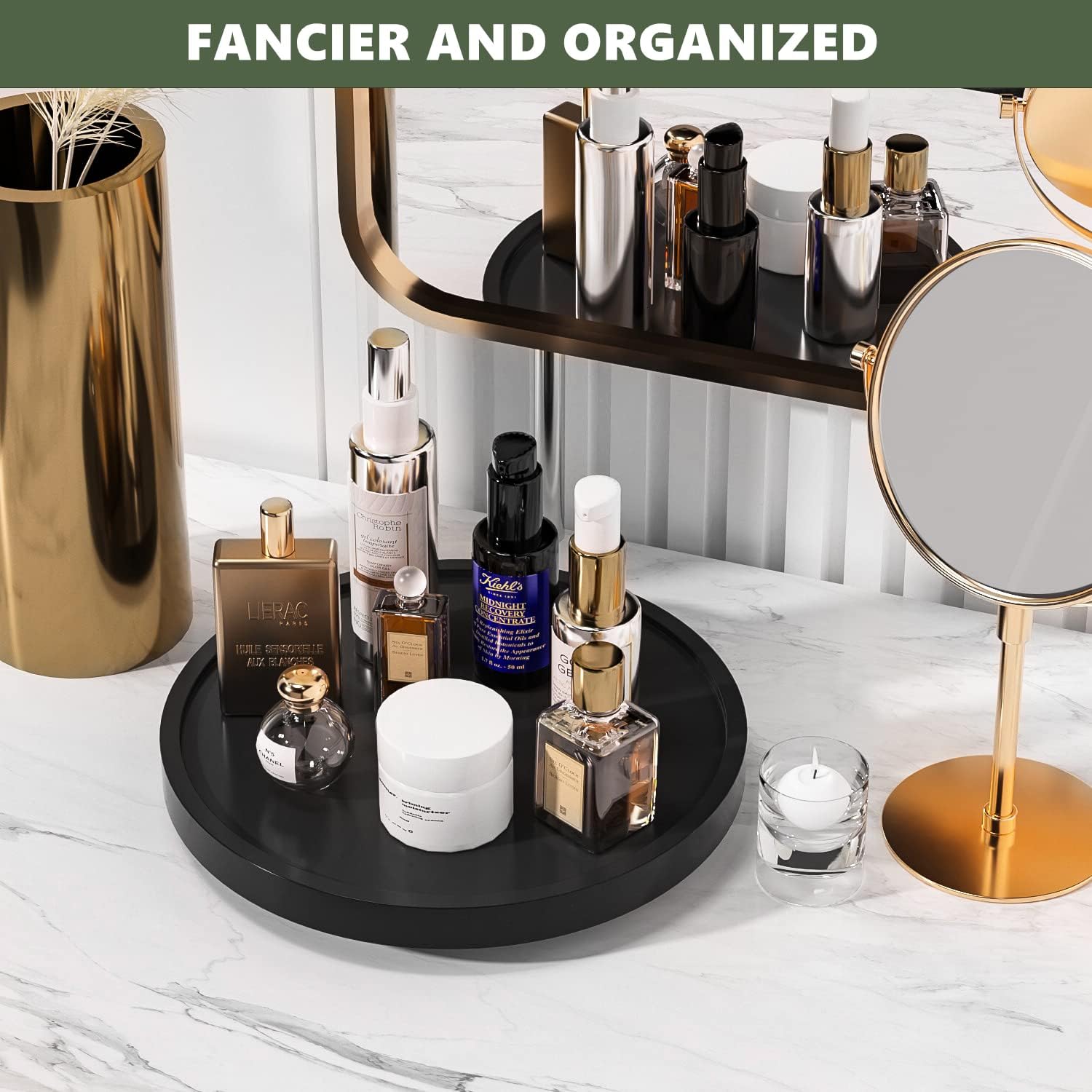 Turntable Vanity Tray 10 Inch for Perfume Candle, Bamboo Kitchen Sink Countertop Organizer Keep Glass, Sponge and Soap Bathroom Coffee Table Decorative Black (VFLZ)