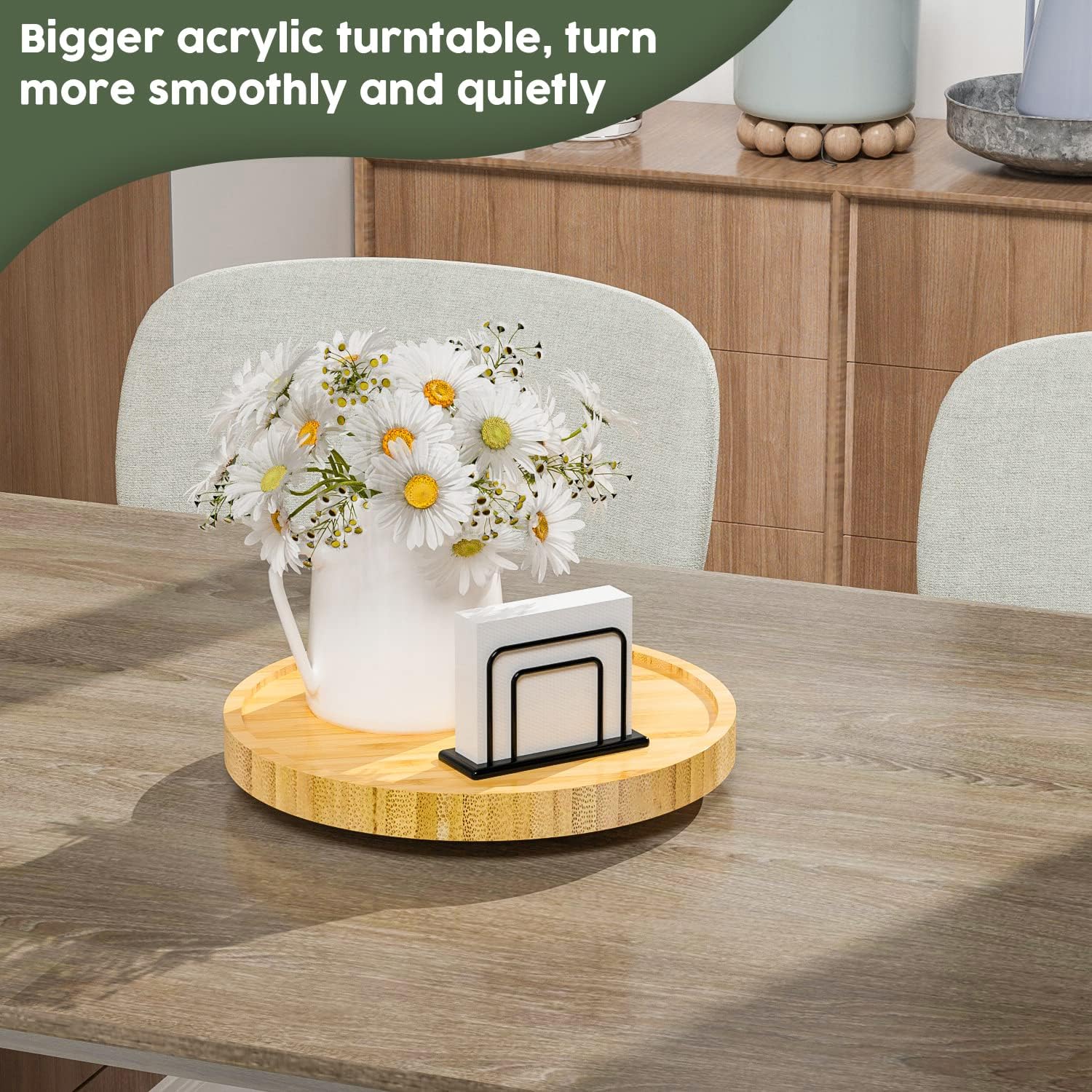 - Cooking assistant: lazy susan organizer perfect for organizing salt, vinegar, pepper, olive oil close to stove and easily reached; Center piece for table to hold napkin holder, honey, cinnamon, sugar and a vase; Helps keep table nice and organized