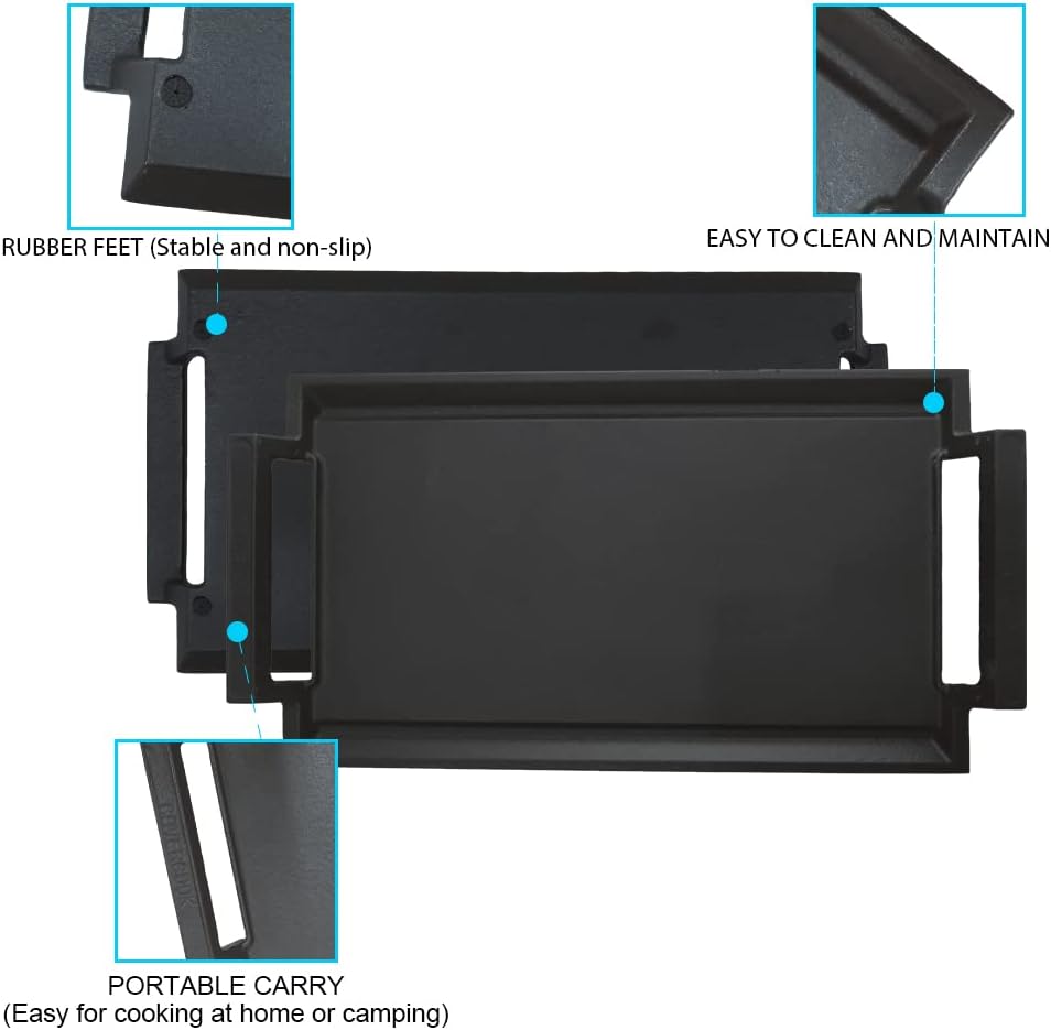 - 【Mutiple Usage】 The Cast-iron griddle is made with natural materials and can be used ontop of many cooking surface, such as induction hob. Also, it is the perfect accessory for cooking and grilling on a gas stove top, oven, campfire; For entertaining family and friends at home, or barbecue in the open. IMPORTANT NOTE: Please remove 4 of the rubber feet before placing on these surfaces, except induction hob