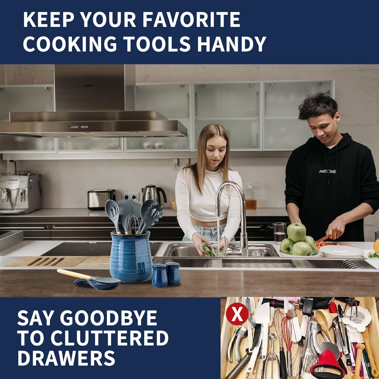 - DON'T RUMMAGE THROUGH THE MESSY DRAWERS: Use kitchen utensils immediately with a gentle wave of your hand. Whether you are flipping pancakes or serving soup, our cooking utensil holder ensures that the kitchen tools you need are within reach. And they are dishwasher safe and very easy to clean.