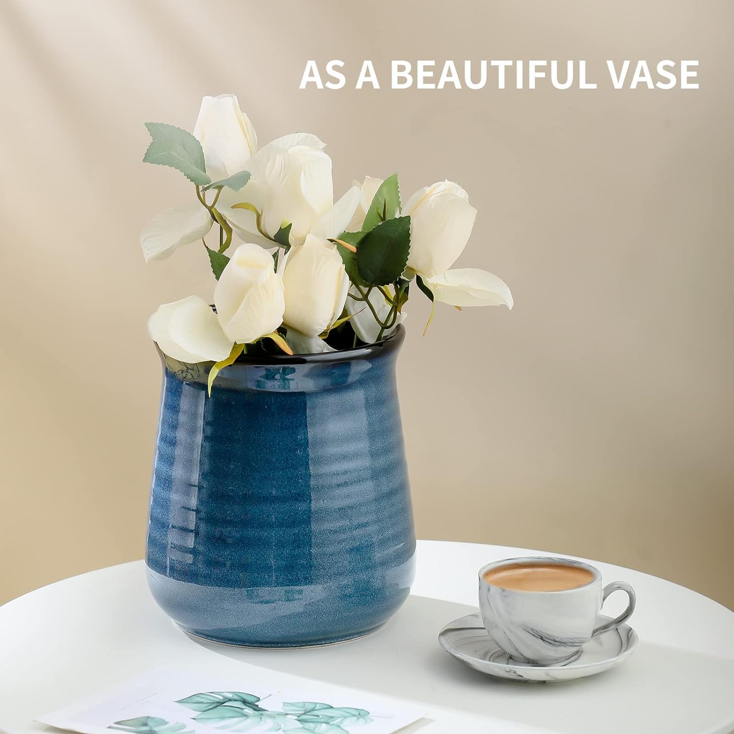 Hasense Large Utensil Holder Crock for Kitchen Counter, 7.1" Ceramic Cooking Utensil Organizer for Countertop, Farmhouse Vintage Utensil Caddy for Spatula Spoon, Rustic Home Table Decor, Blue