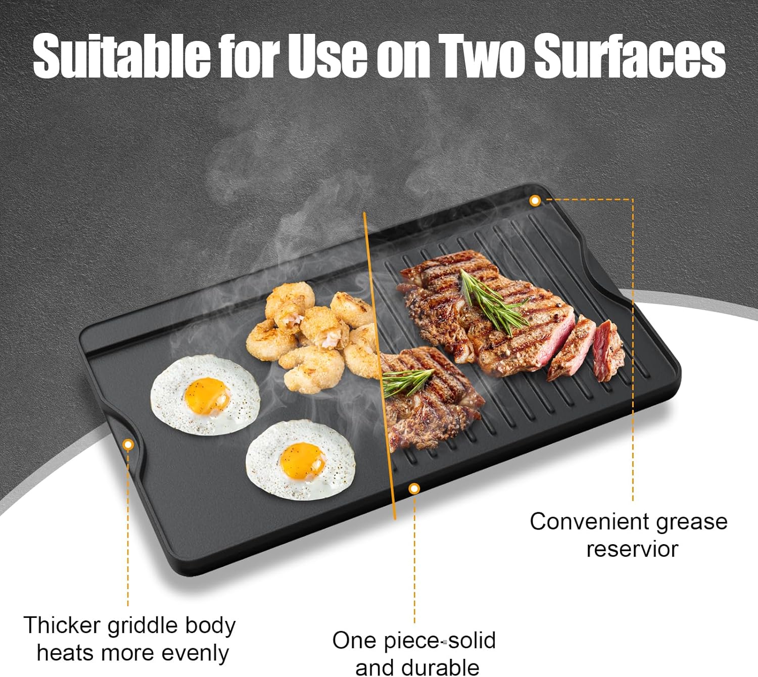 AJinTeby 2-in-1 Reversible 16” x 24” Pre-Seasoned Cast Iron Cooking Griddle for Gas Stove/Charcoal/Electric/Propane/Gas Grill, Flat Griddle Top Plate for Camping Tailgating
