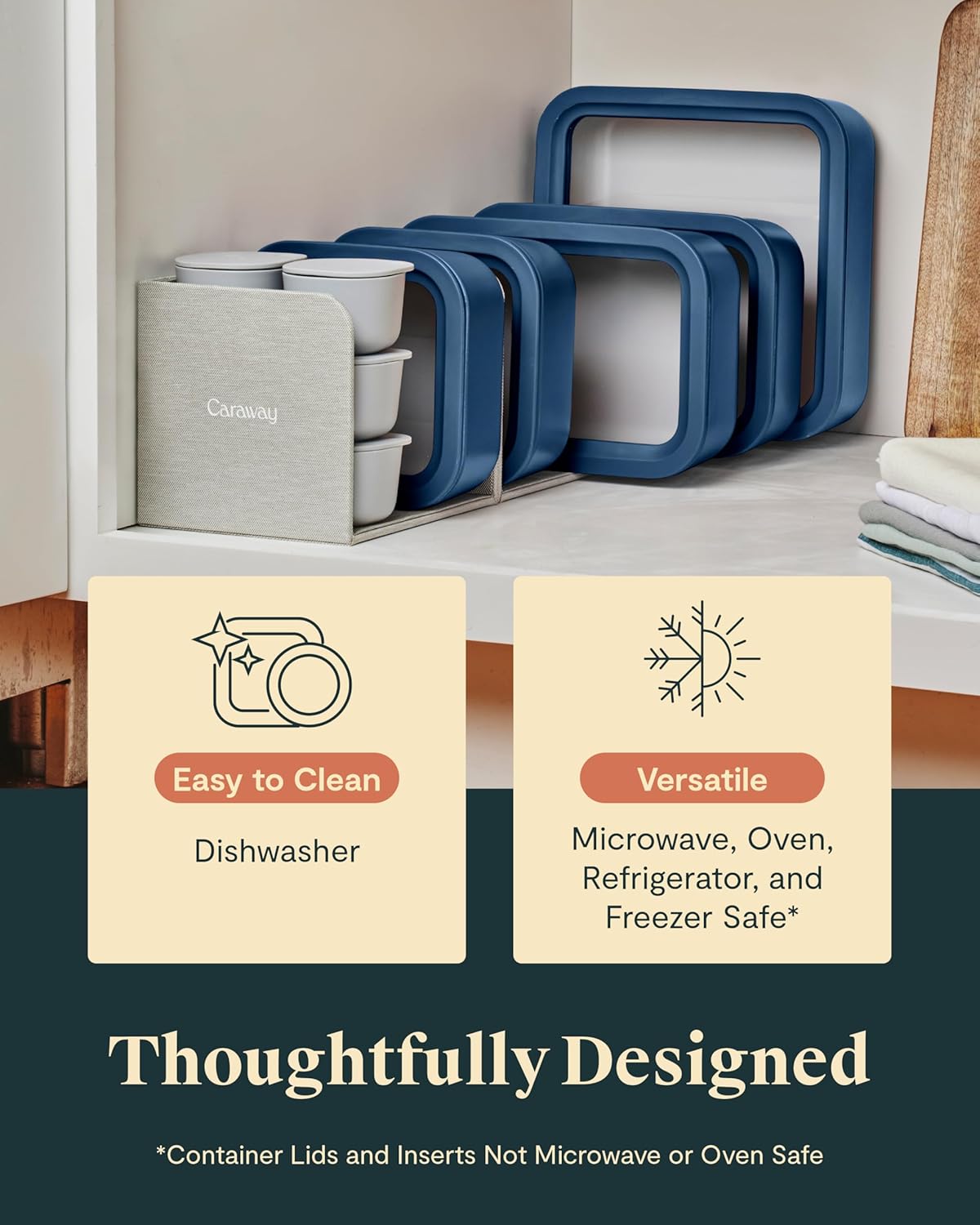 Caraway 14pc Glass Food Storage Container Set - Easy to Store, Non Toxic Lunch Box - with Glass Lids - Includes Storage Organizer & Dot & Dash Inserts - Navy