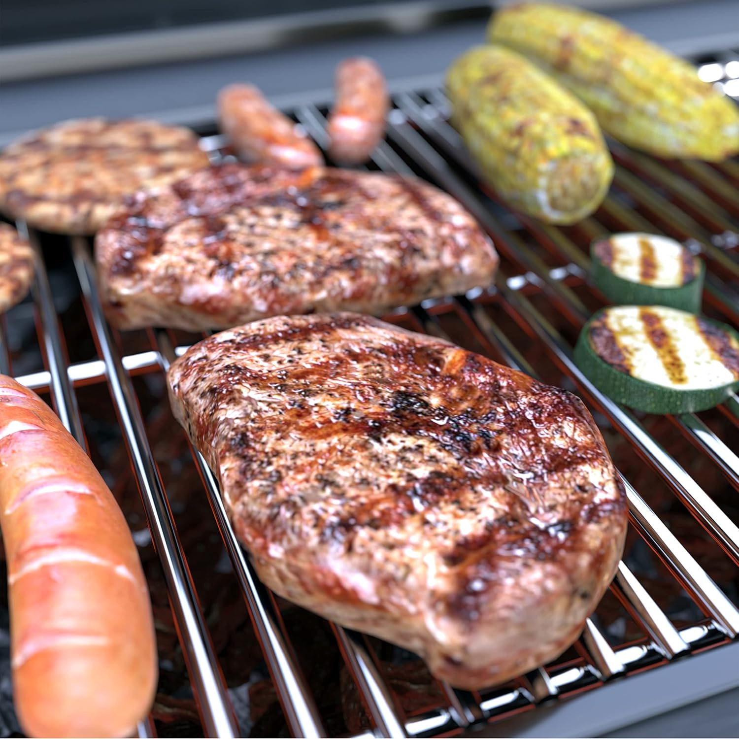 - Material: The grill grate is made of solid stainless steel and can be used for a long time. It will not peel off or rust as easily as cast iron and enamel bars. It is more durable and easier to clean. The stainless steel grill grate is not only evenly heated, but also evenly spaced grid will leave beautiful grill marks on the food, increasing the barbecue interest