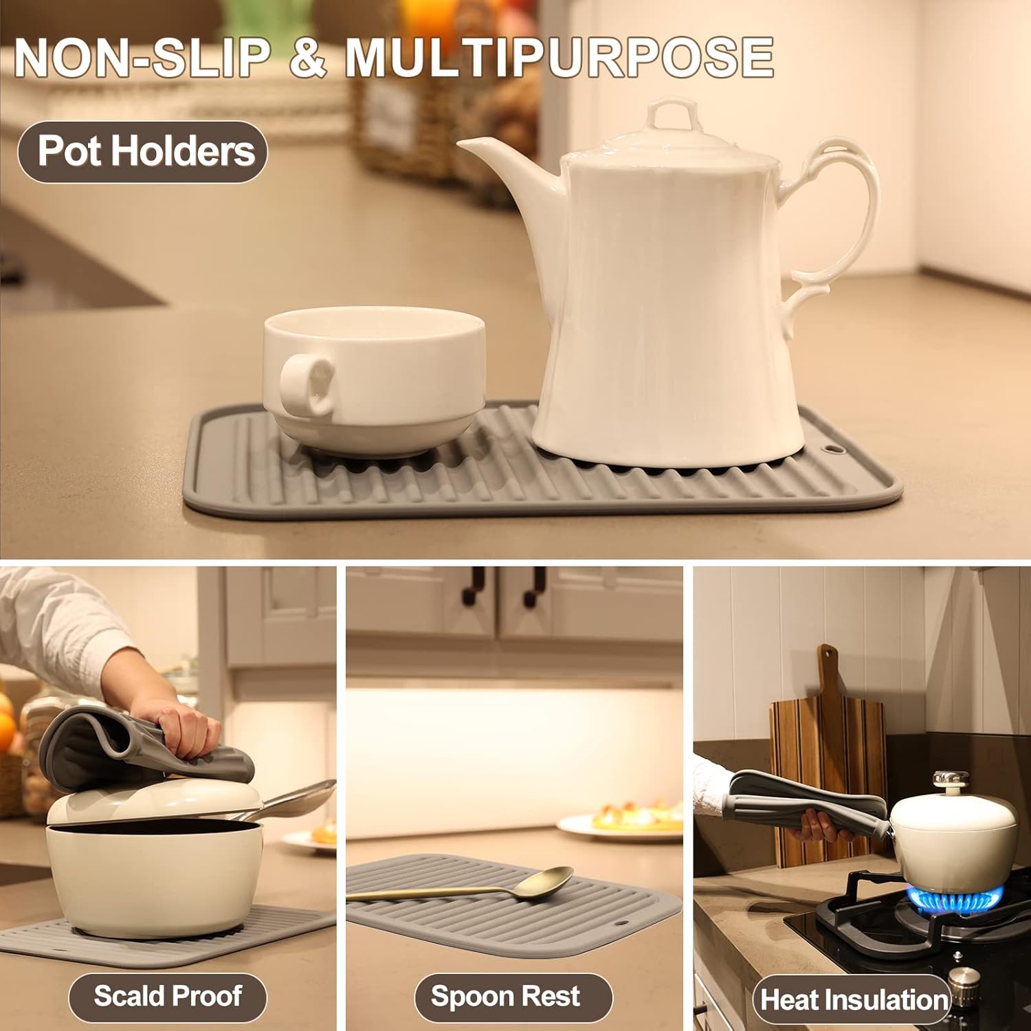 - MULTIPURPOSE KITCHEN TOOLS - Our silicone trivets for hot dishes are non-slip, flexible and soft enough to comfortably grab hot pots and pans, jar opener, drying mat or potholders. Silicone hot pads for kitchen are perfect for use in an oven, microwave, or freezer, protect your hands from hot and cold.