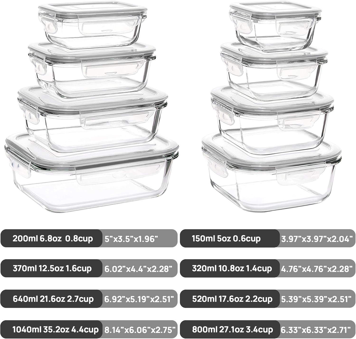 - 【Set of 8 Glass Storage Containers】Rectangle (35.1OZ)+(21.6OZ)+(12.5OZ)+(5OZ); Square (27.1OZ)+(17.6OZ)+(10.8OZ)+(6.8OZ); large and small containers are versatile for different use: meal prep food, leftover, sauce, lunch to go, RV, picnic, camping.