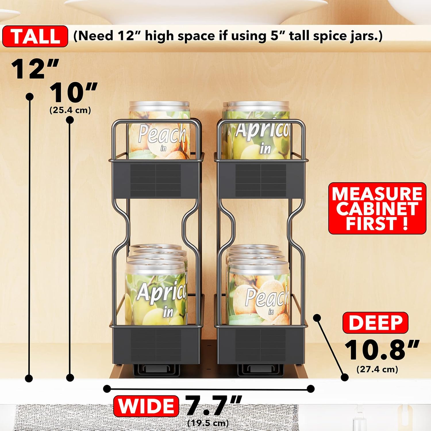 - EASY RACK INSTALLATION - It is easy to install by removing the sliding base bottom. This rack needs 7.7"wide x 10.75"deep x 12"high cabinet space with standard spice jars on the upper tier.